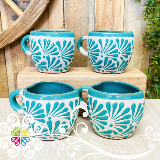 Set of 4 Teal Corazon Clay Mugs - Set Taza Barro