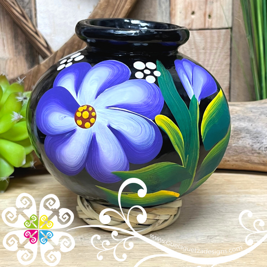 Medium Painted Cantarito Black Clay Vase - Barro Negro Oaxaca