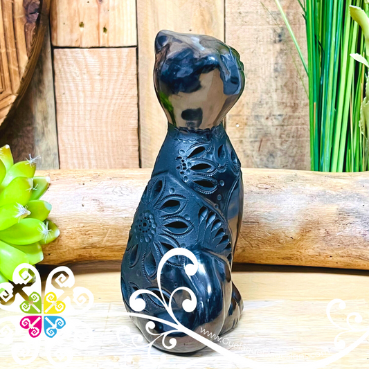 Medium Poised Cat Black Clay Figure - Barro Negro Oaxaca