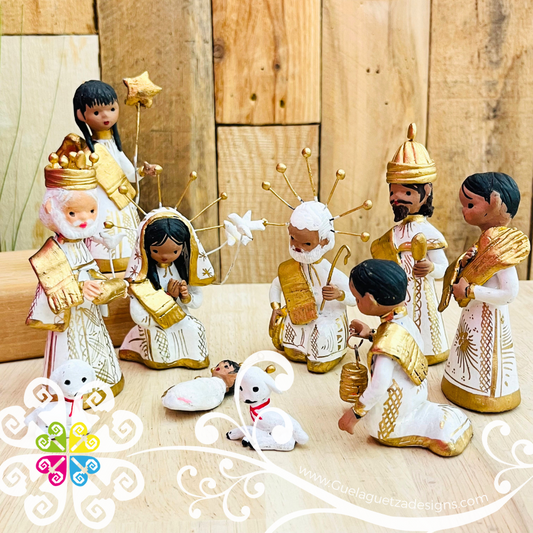 White/Gold Clay Nativity Set - Nacimiento Navideno
