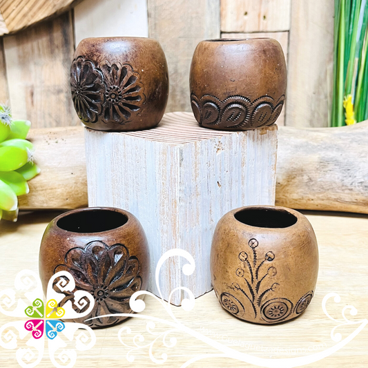 Set of 4 Carved Barrilito Tequilero - Barro Café Oaxaca
