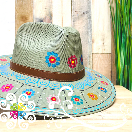 Green Olive Hand Paint Summer Hat - Flower Garden Design
