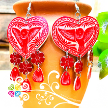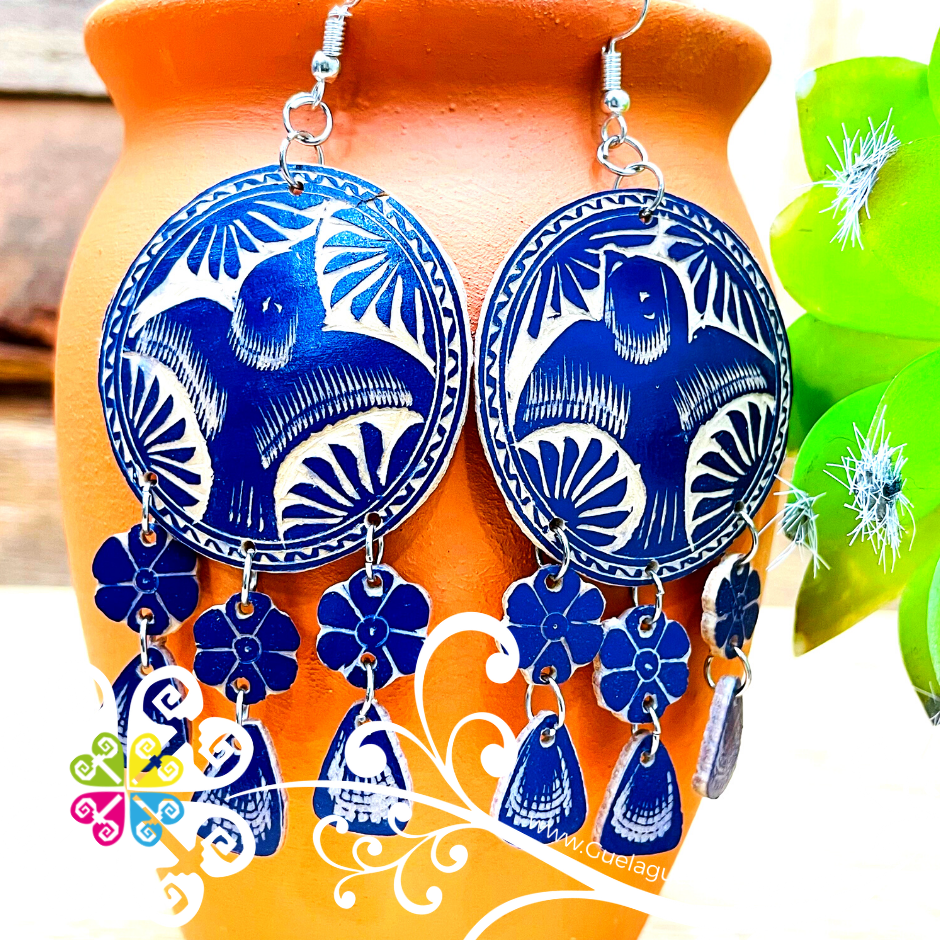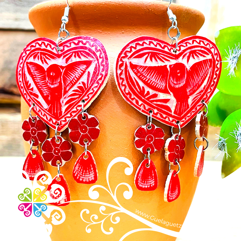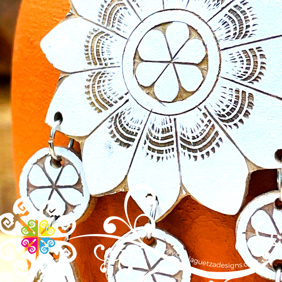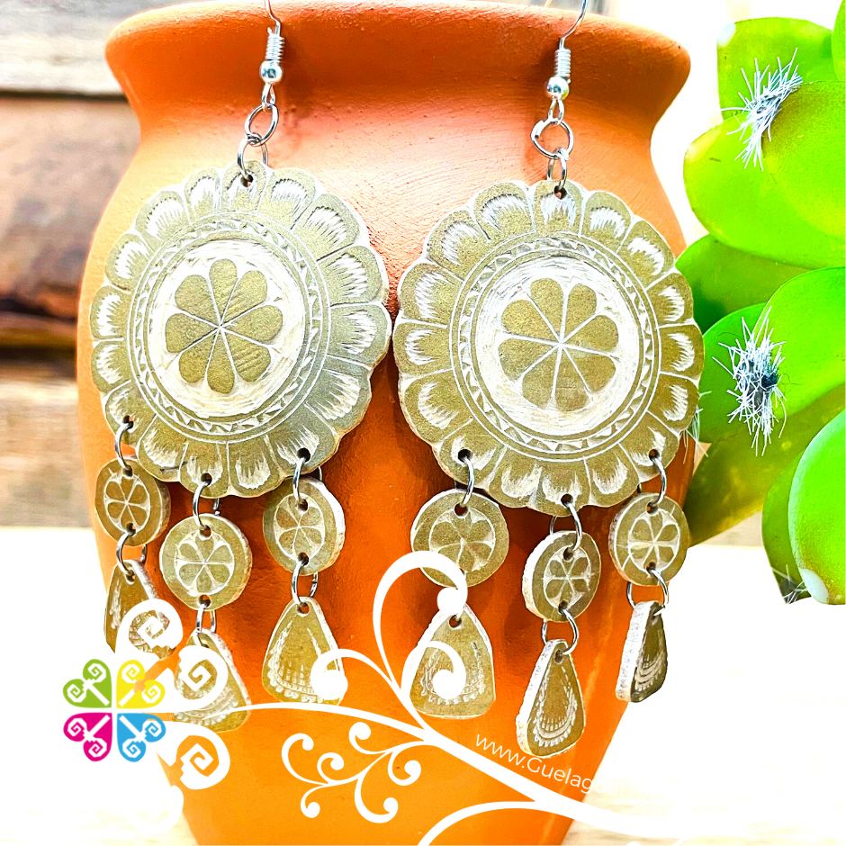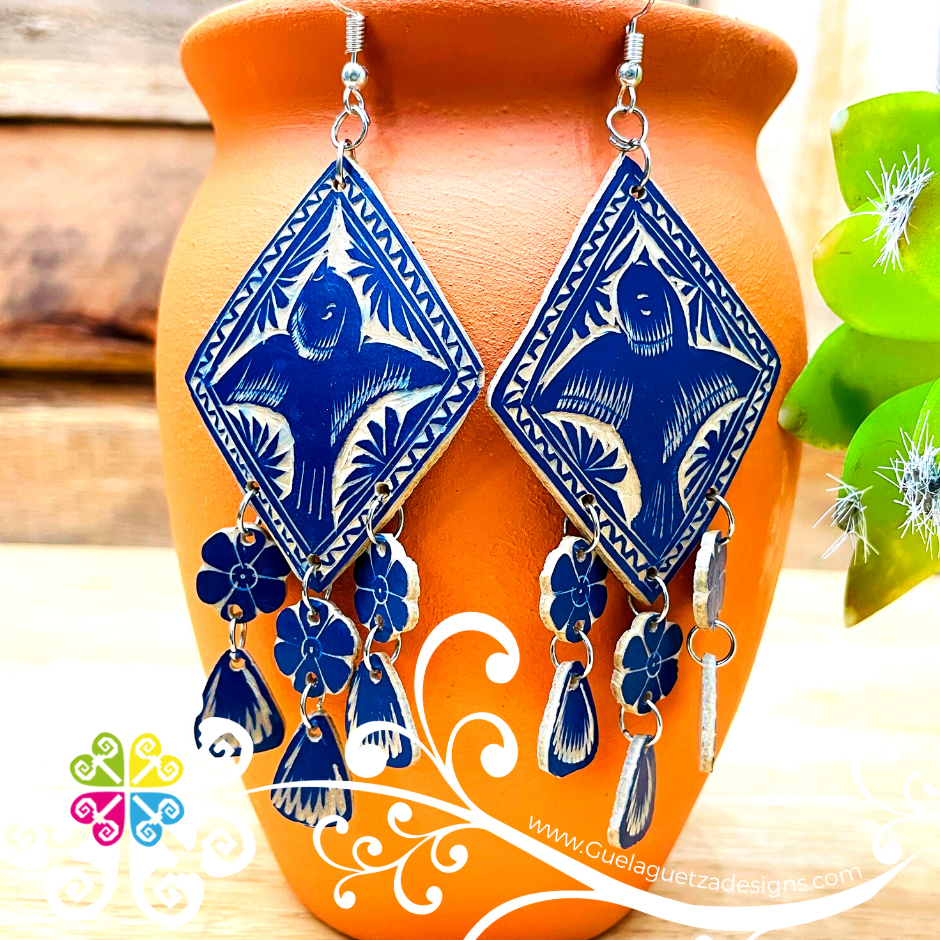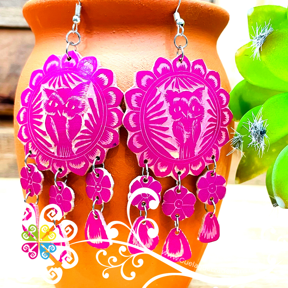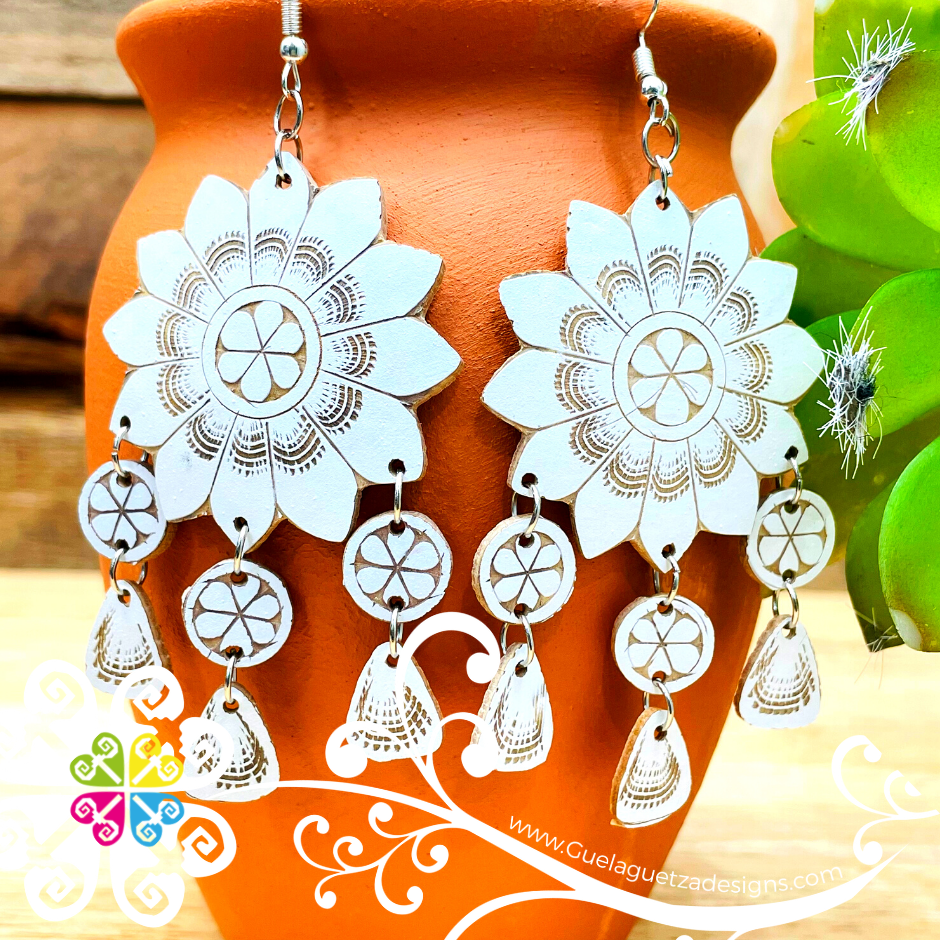 One of a kind earrings featuring a design made from gourd, painted and every detail is carefully hand carve by artisans from Pinotepa, Oaxaca. Decorated with hanging matching designs. You will love every detail of it! Light weight for every day wearing.