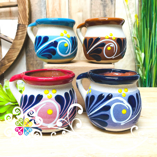Set of 4 Medium Decorated Mexican Clay Mugs - Set Taza Barro
