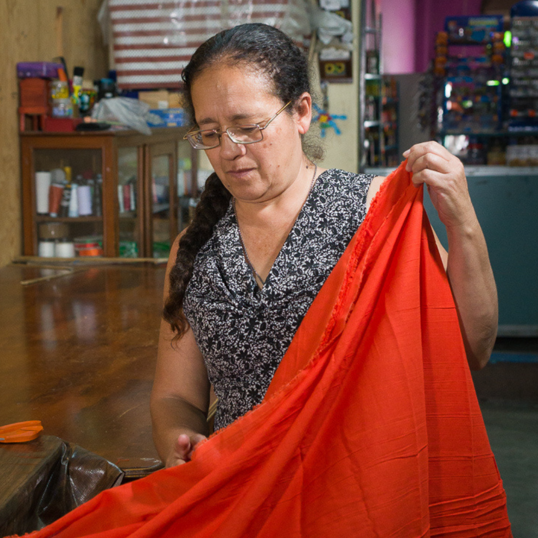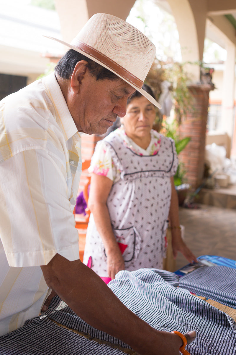 Originally from beautiful Mitla, Oaxaca. Pedro learned to use the loom under his uncle, developing an early love for the craft of weaving yarn. Today, Pedro and Lore have nourished that love by establishing two small workshops, one that houses three looms and the other centers around sewing where Lore is in charge of designing, cutting, and sewing the garments. The two work as a team, providing their children with a better standard of living.