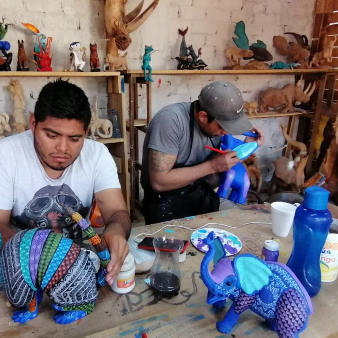 Sueño Profundo is located in Zaachila, Oaxaca. The workshop is formed by six proud craftsmen of Alebrijes; which are carved wooden figures and amazing miniature pieces of art. Each piece is inspired by the cultural mosaic from Oaxacan indigenous groups. Nature’s elements such as sun, earth, water, wind, and fire are represented on each colorful design.