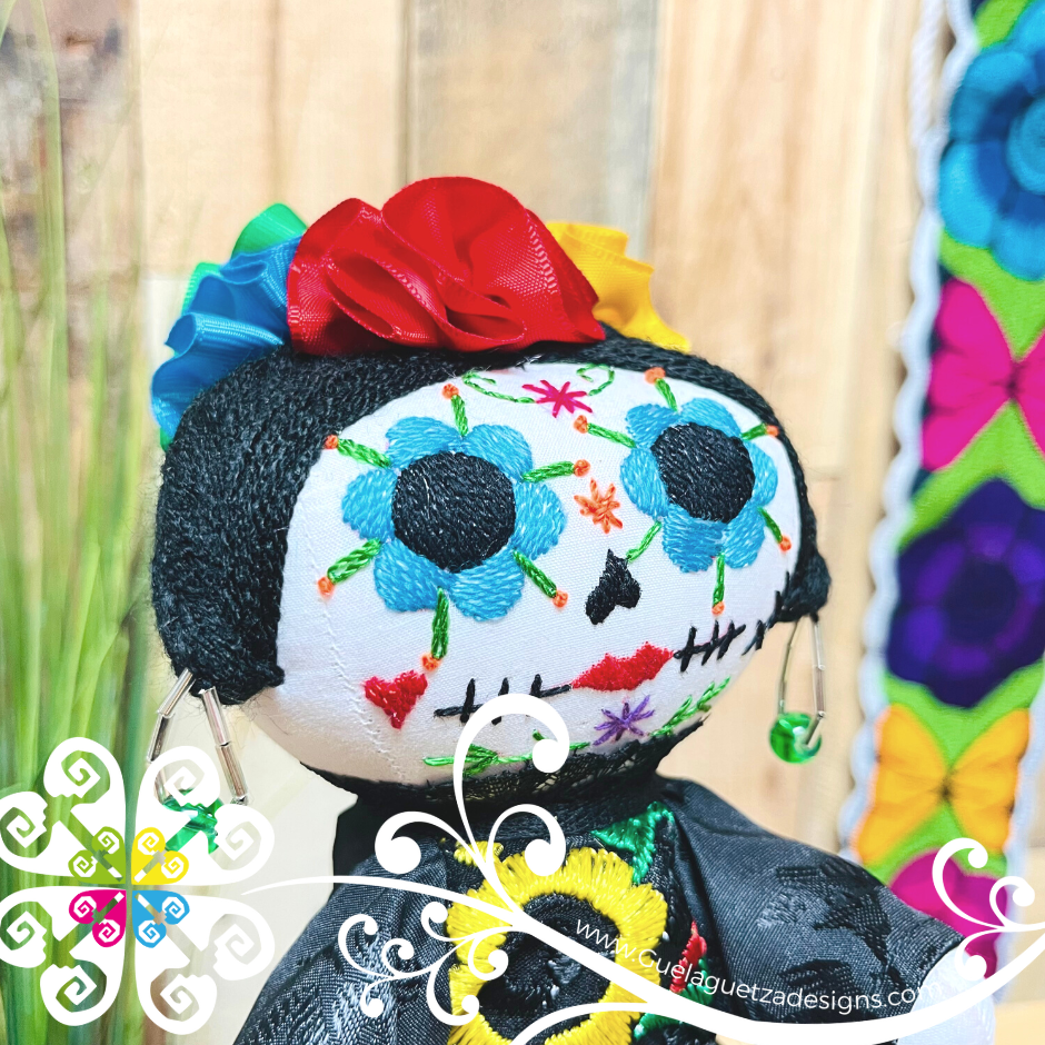 Her dress inspired on the otomi culture, beautiful and coloful machine embroider flowers on the skirt and top, cotton lace, and a removable apron. Her head is decorated with a ribbon headband and braids. Her face all hand painted inspired on the Mexican catrina.