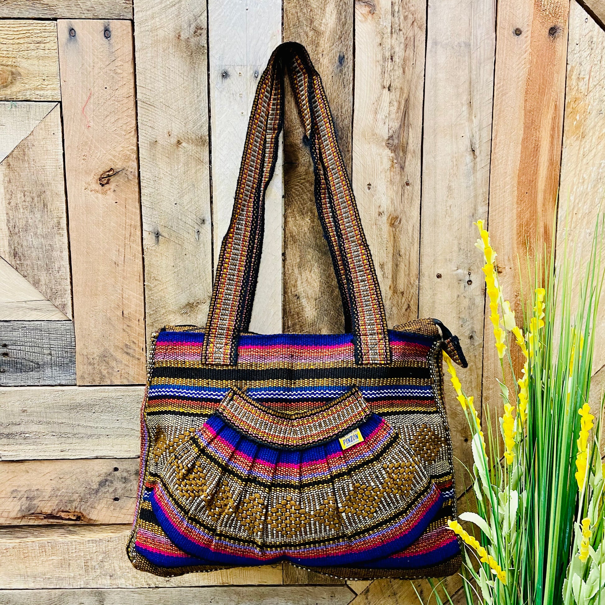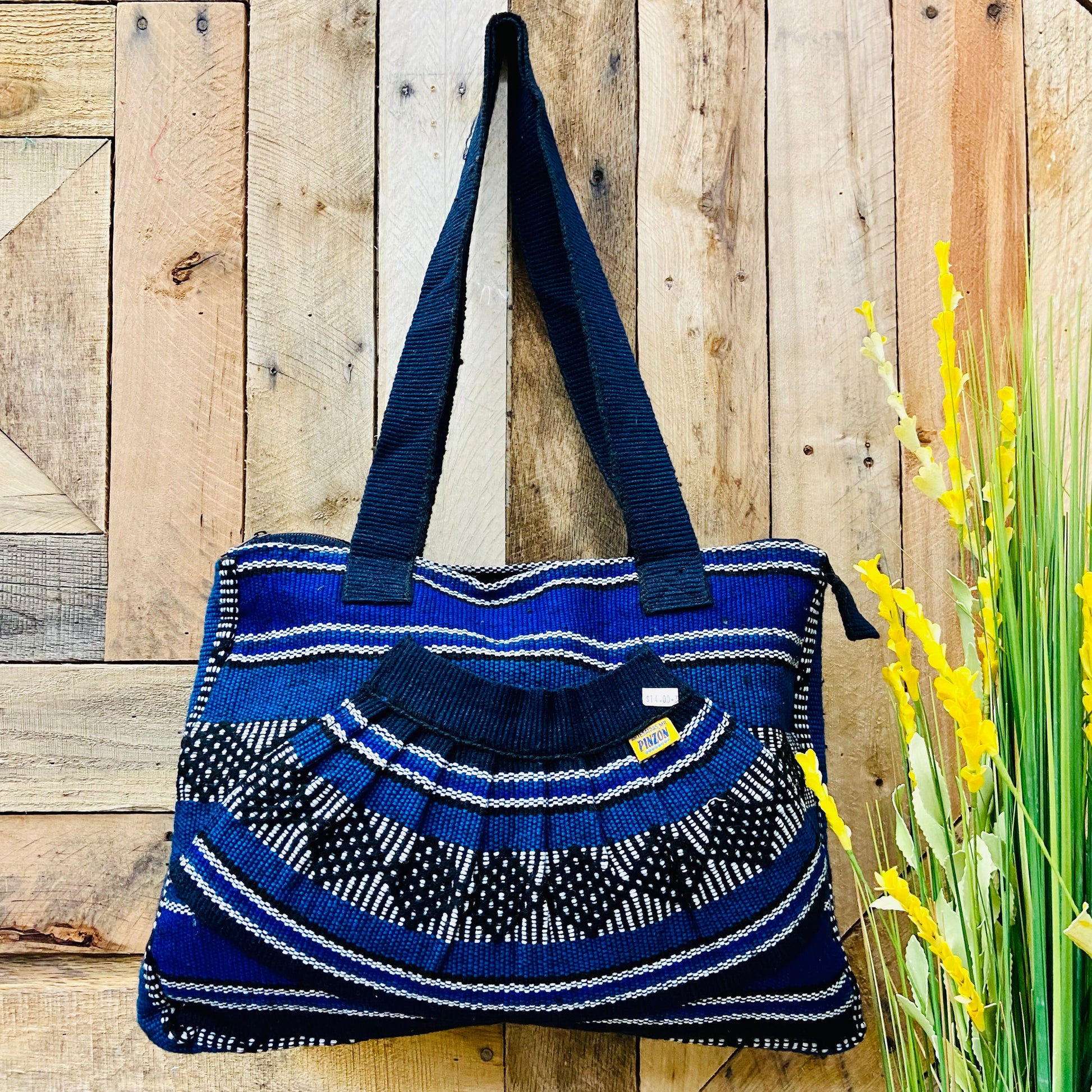 Elegant model with two handles to carry on the shoulder, upper closure to secure content, and a practical front pocket fan-shaped.