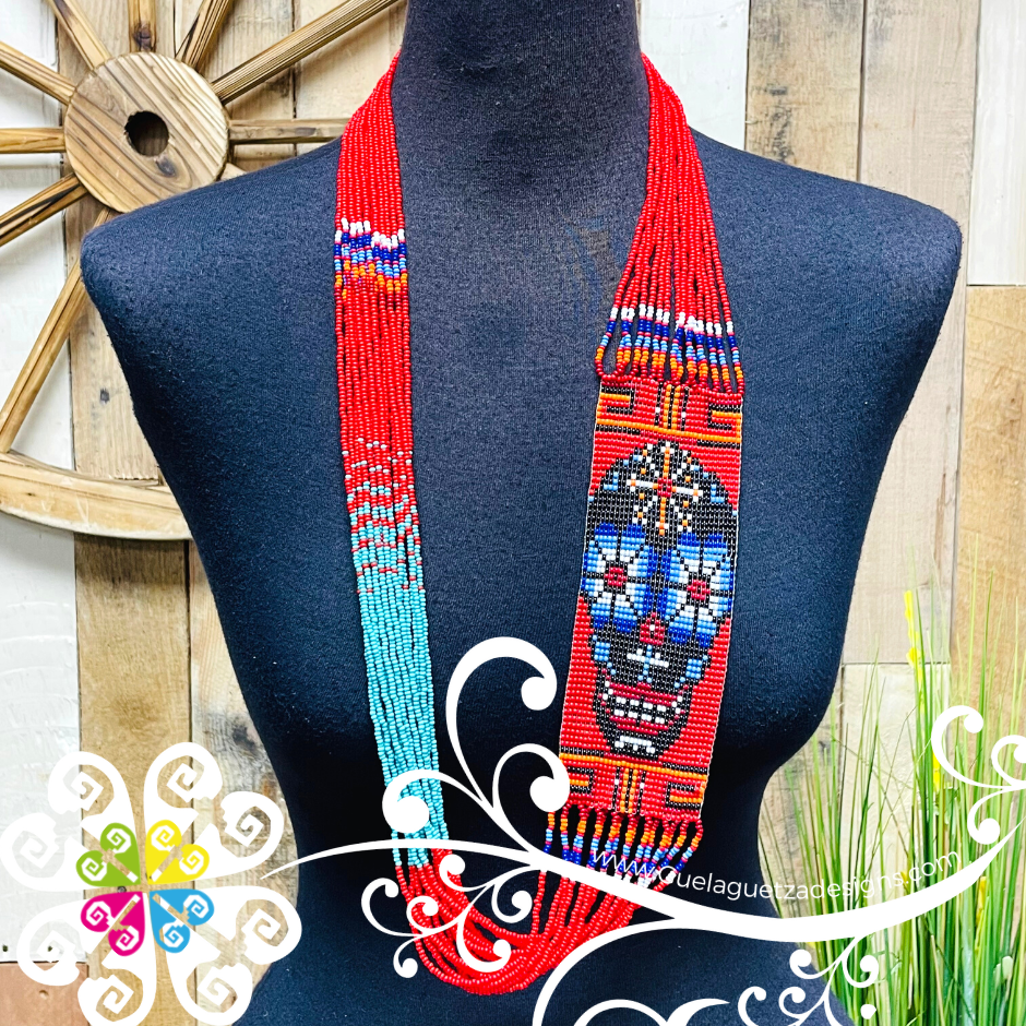 Beautiful long necklace to look elegant and amazing next time you go out. Each design is made with petite glass beads, featuring a beautiful calavera made with different colors that can go from vibrant rainbow palette or just subtle tones.