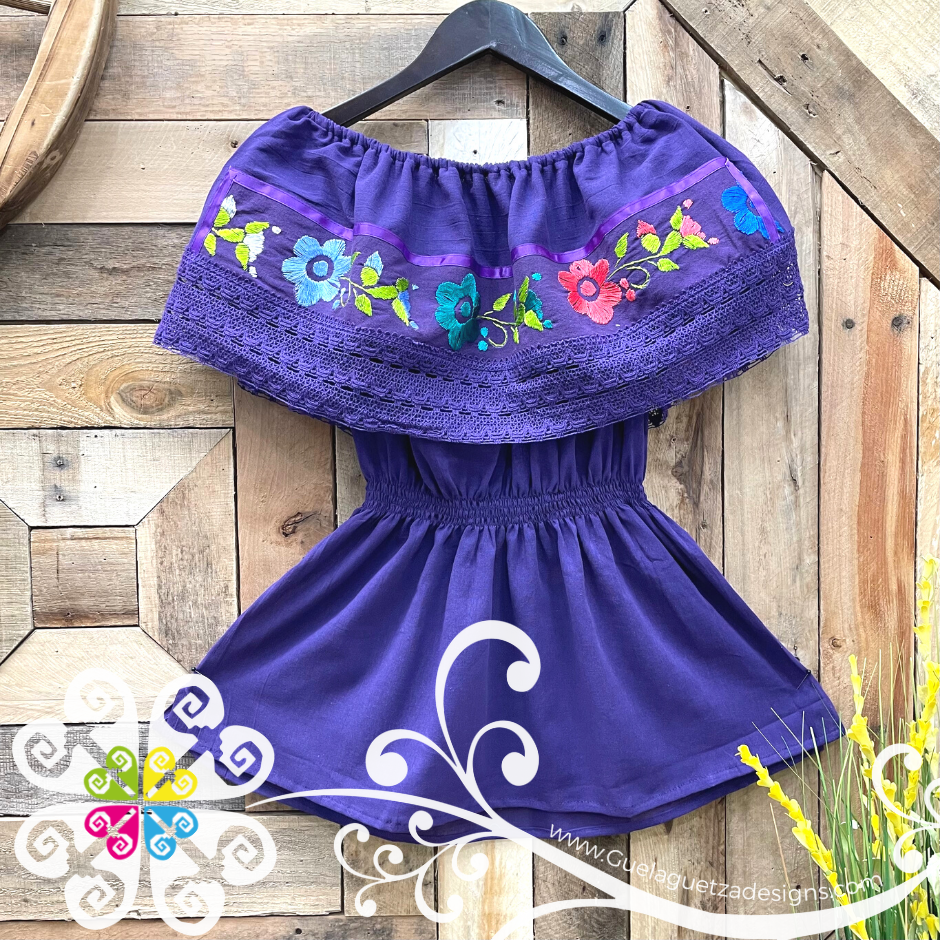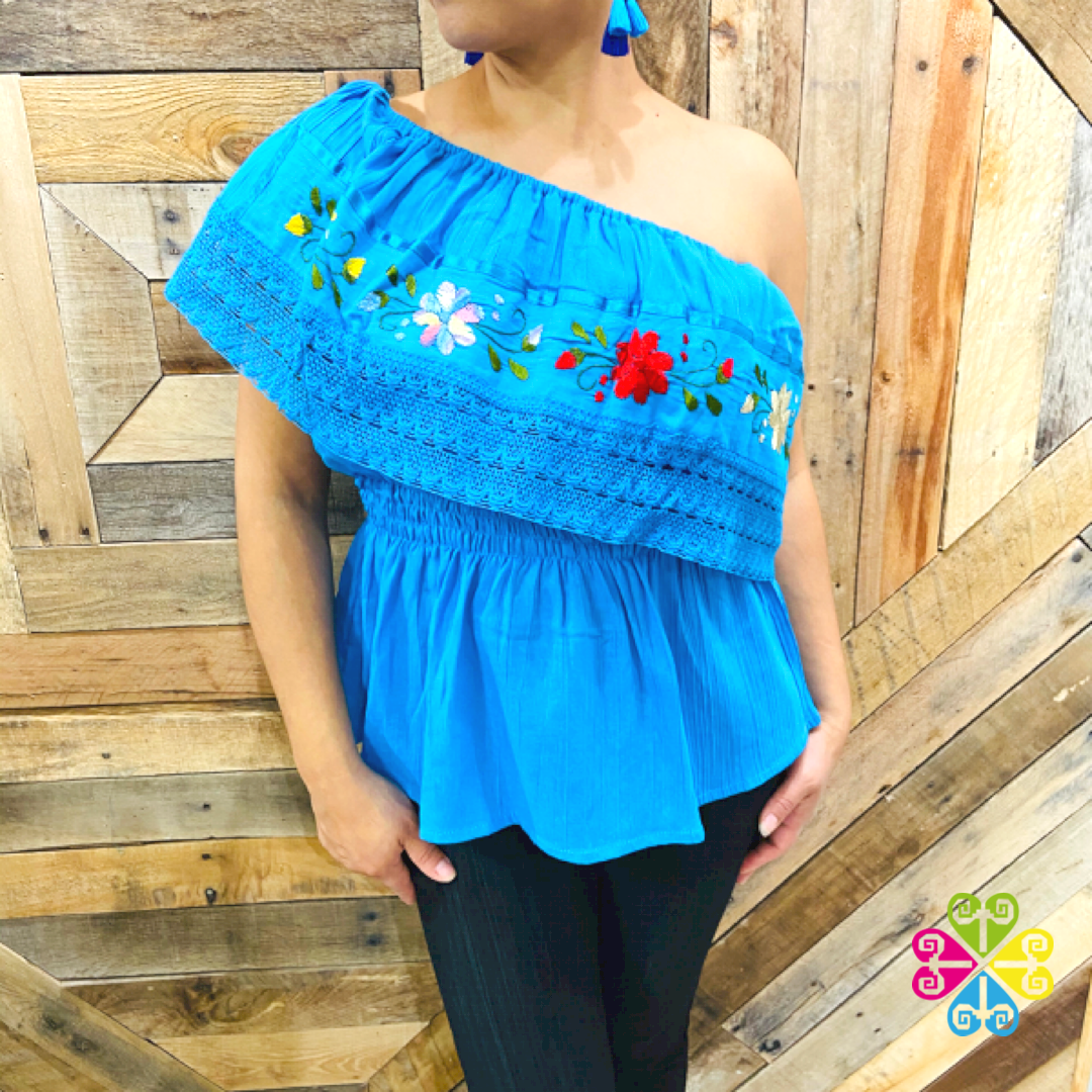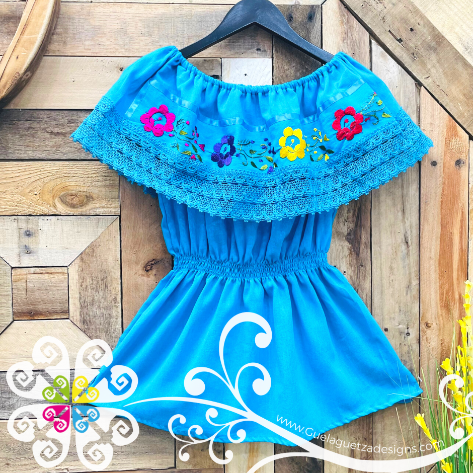 Popular peasant blouse, made with corrugated blanket of different colors. The top part has handmade embroidered strip with cotton lace.