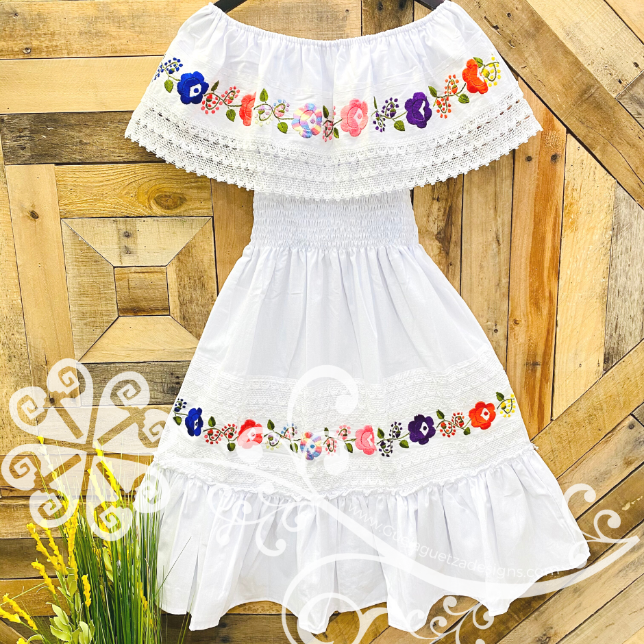 Beautiful authentic Mexican Campesino dress made with 'manta' fabric; soft and fresh fabric with cotton. The ruffle and bottom part features a colorful handmade embroider. The elastic around the waist will form your sexi curves. Wear it many ways (see pictures), you will simply love it!