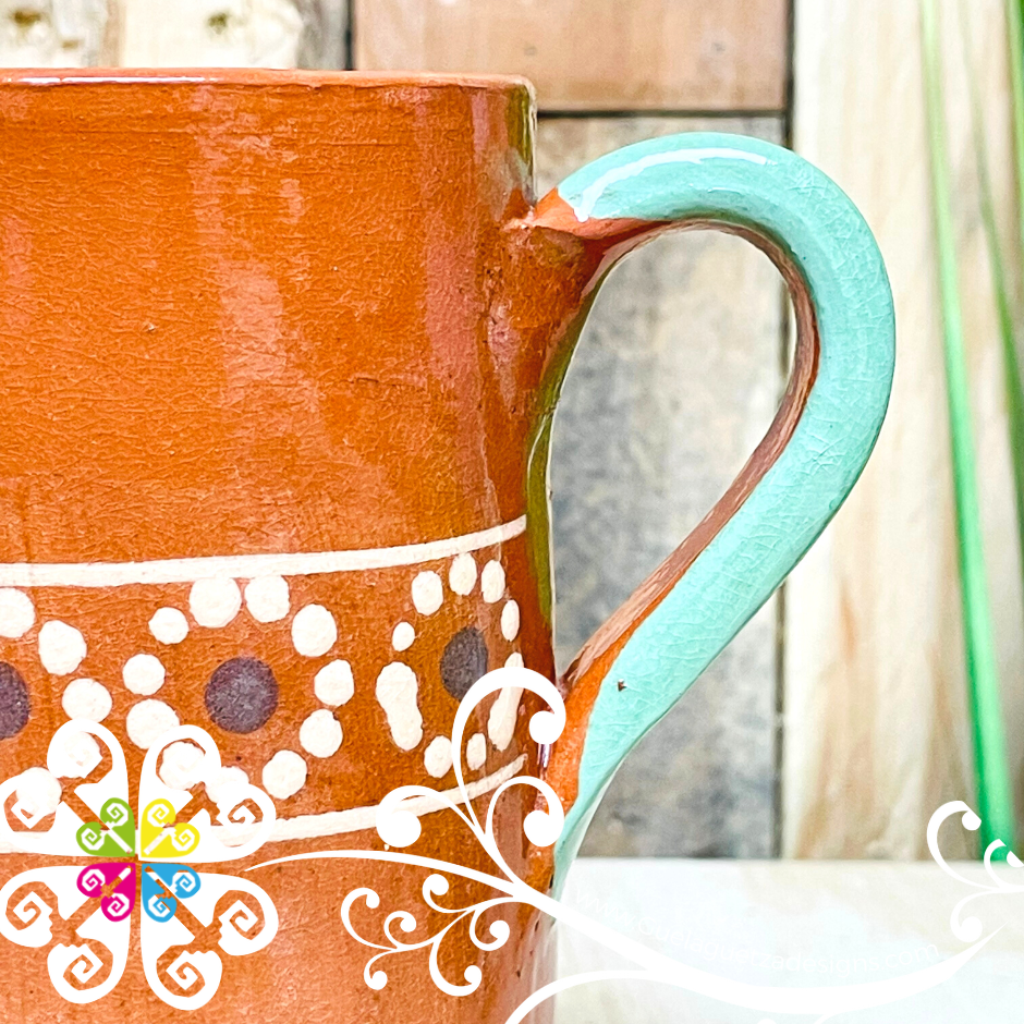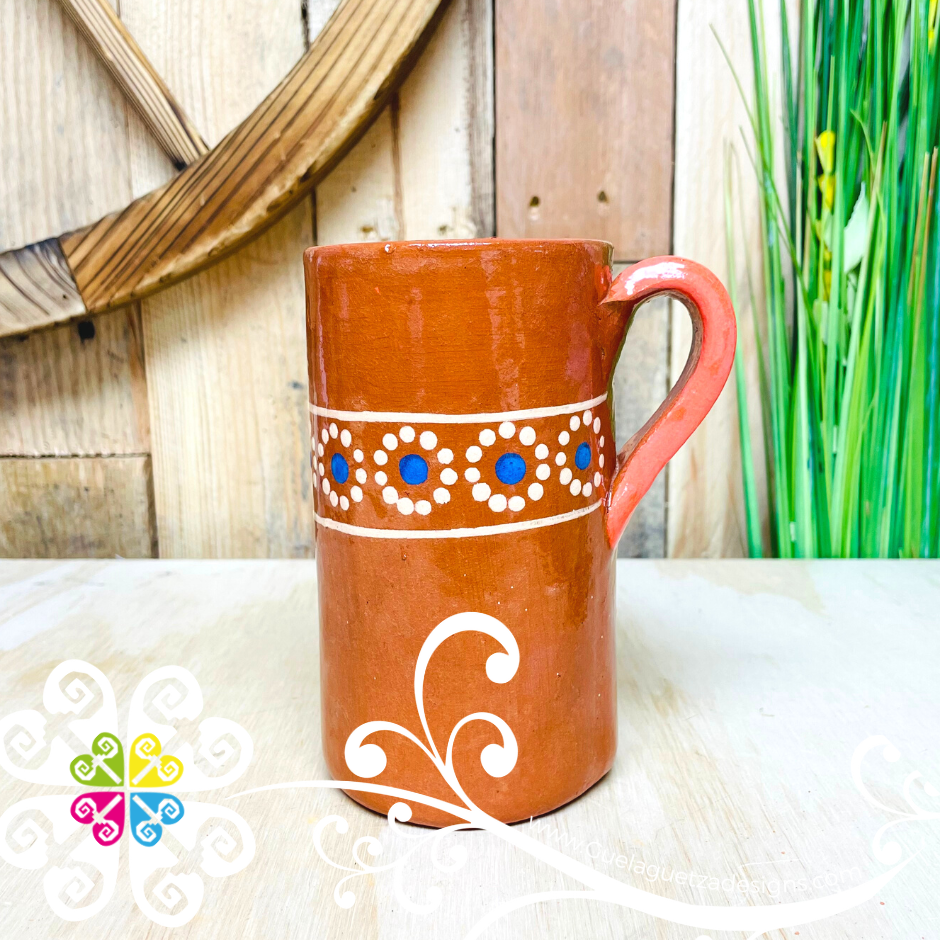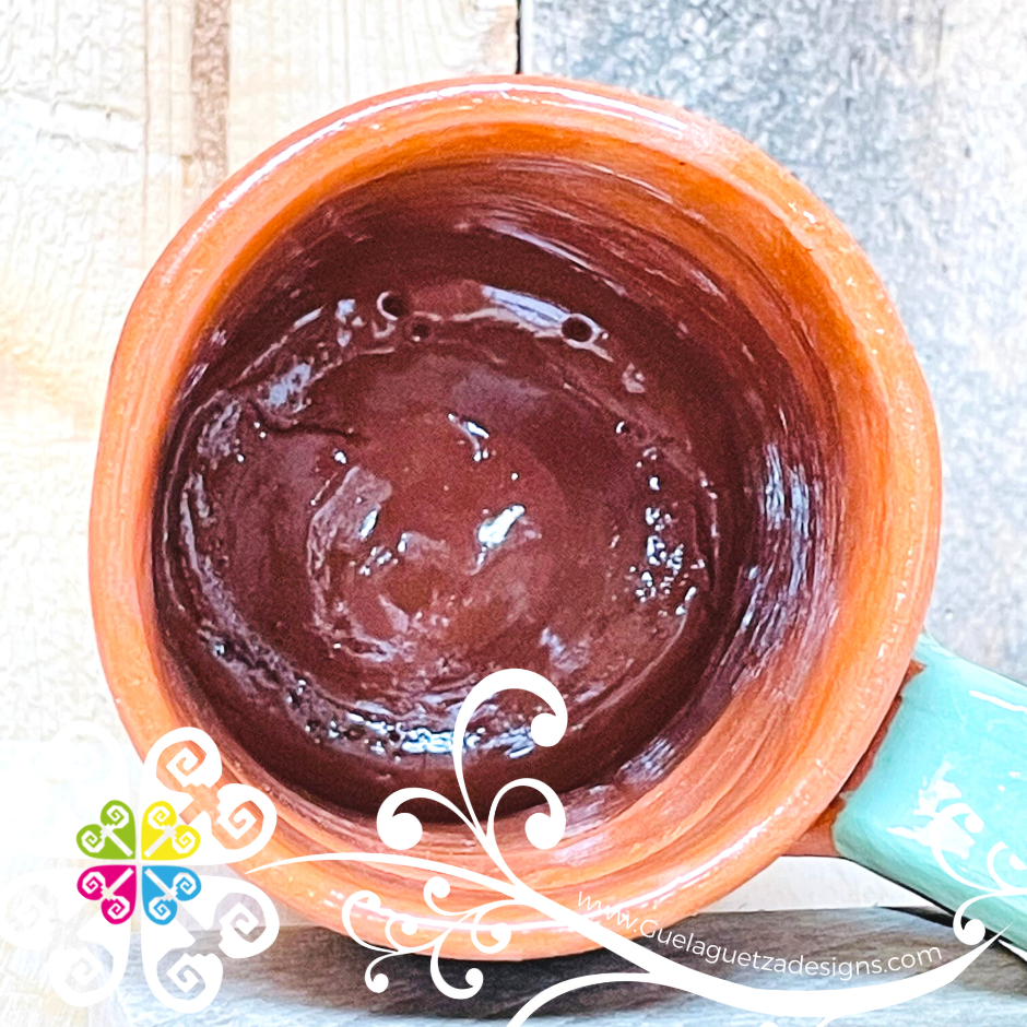 Beautiful clay cup created using ancient process by Mexican artisans from Michoacán, Mexico. Each design is crafted by hand, with love and passion. Perfect for decoration or safe to drink any cold or hot liquids from it.