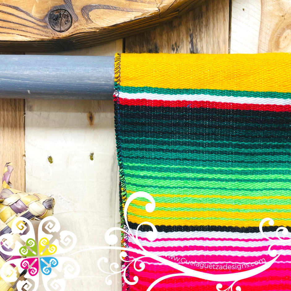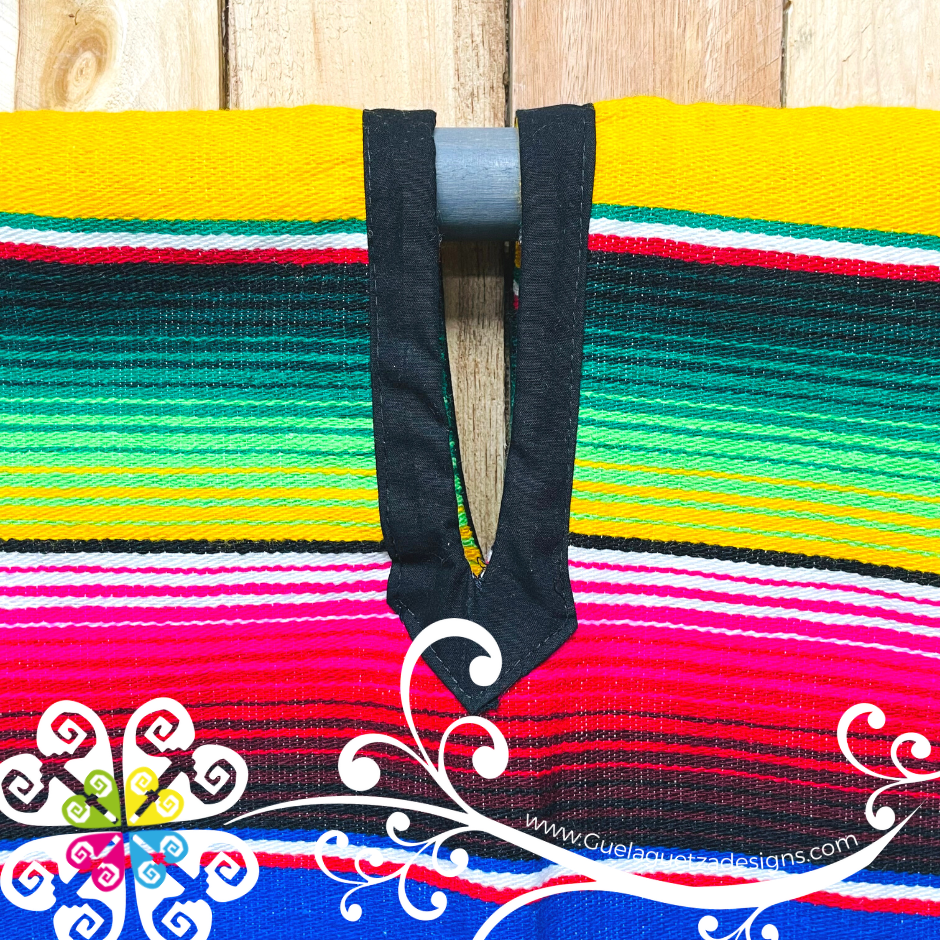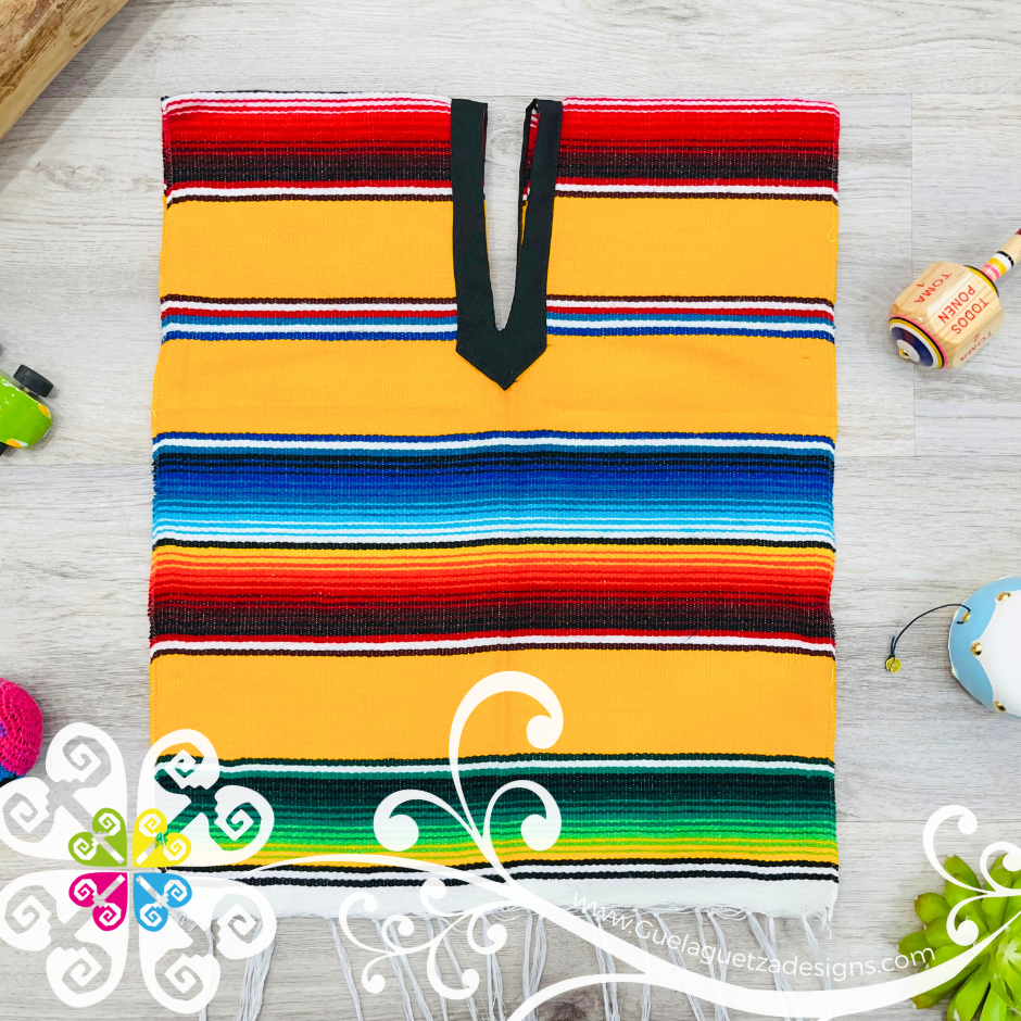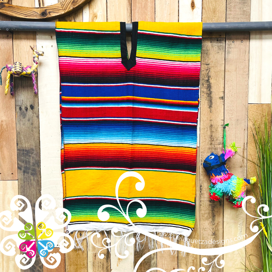 Super cool long poncho featuring sarape fabric. Elaborated with threads of cotton and polyester, hand knitted on both front and back bottom.