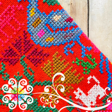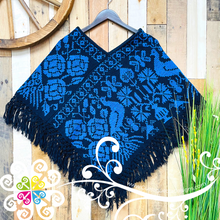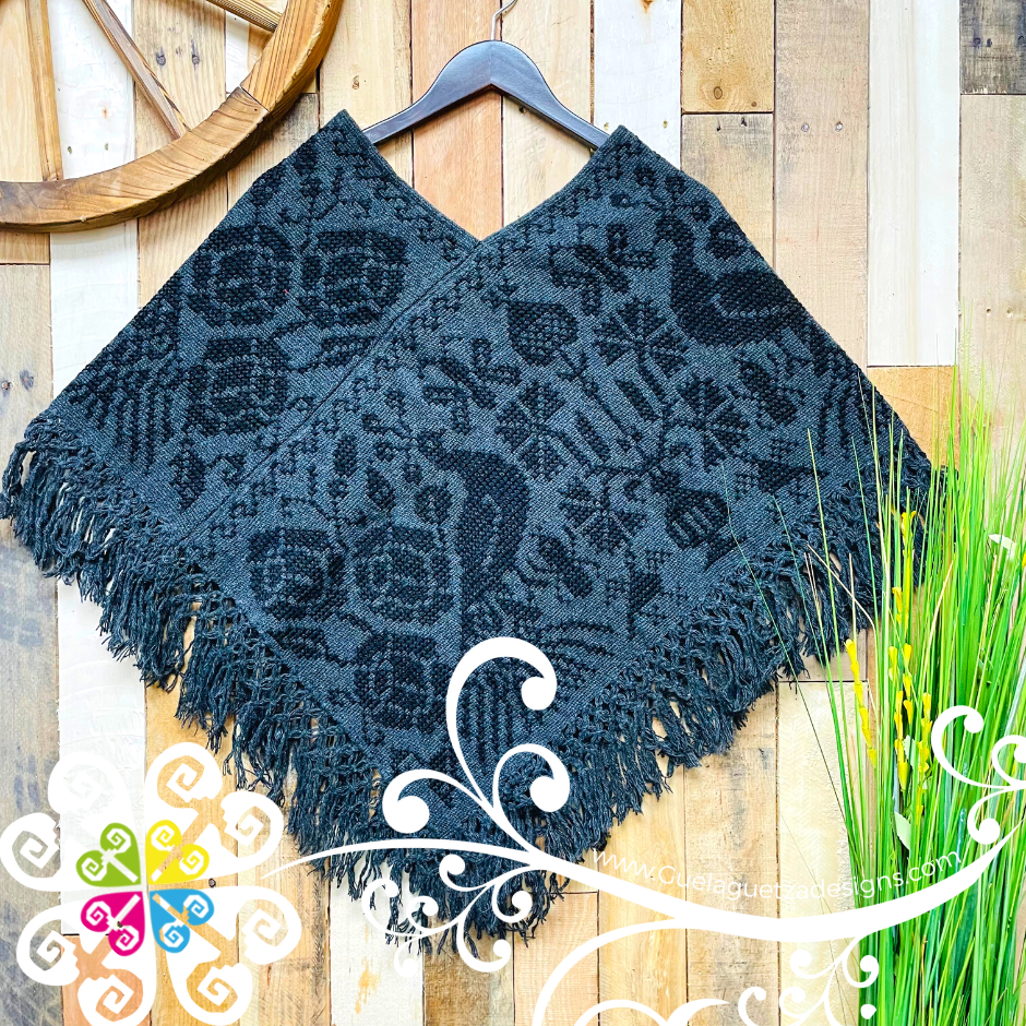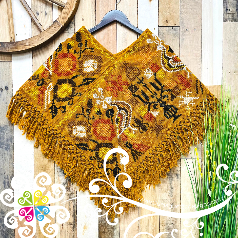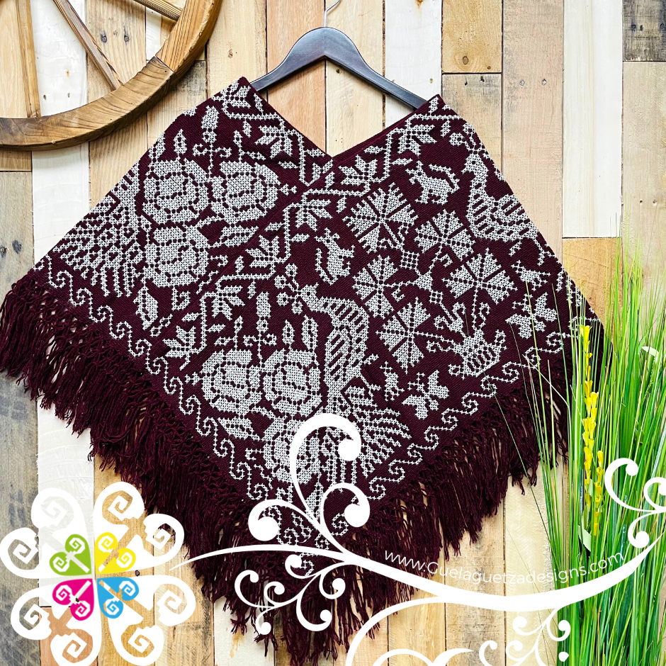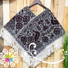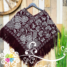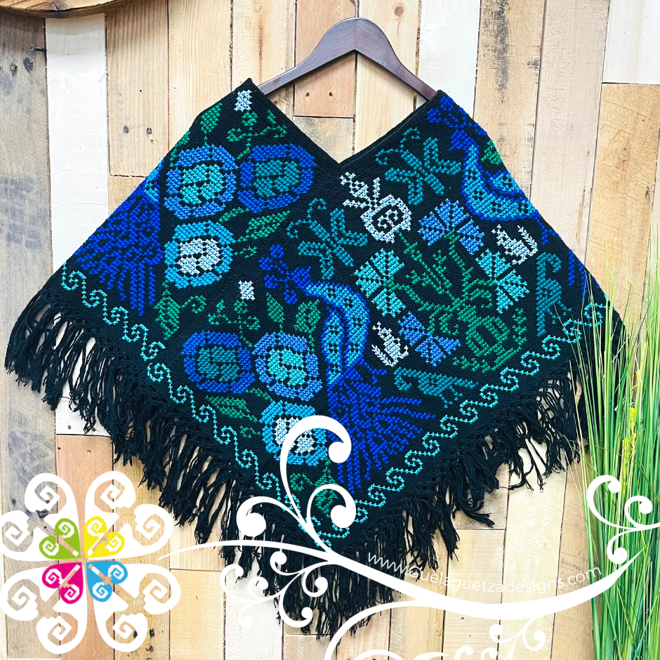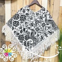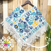 Beautiful one of a kind embroider poncho. Base is made with plain cotton threads and decorated with hand made cross stitch embroider. Featuring a beautiful peacock, flowers and shapes inspired Mexico's flora and fauna. Same design in front and back.