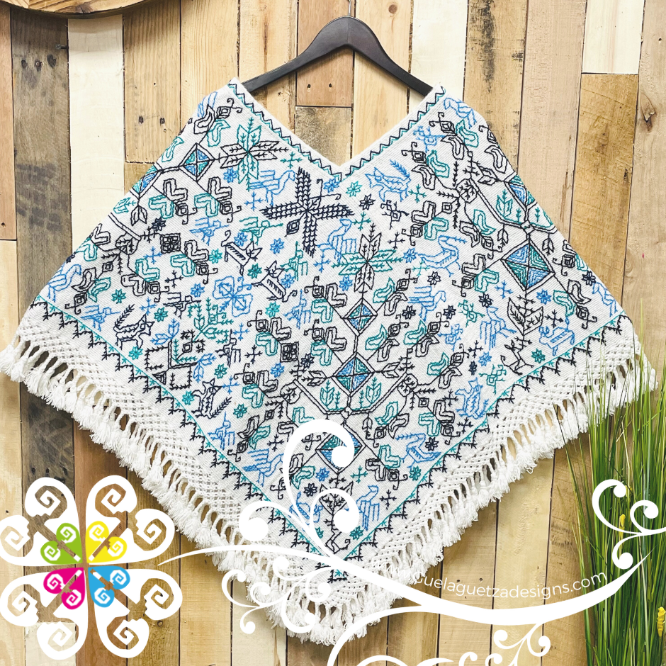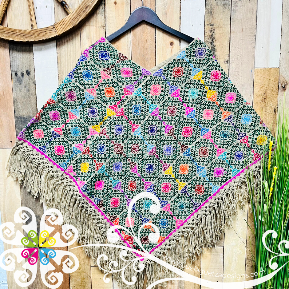 Beautiful one of a kind embroider poncho. Base is made with plain cotton threads and decorated with hand made cross stitch embroider, Featuring super cute little flowers and geometrical designs on the neck and ends. Same design in front and back.