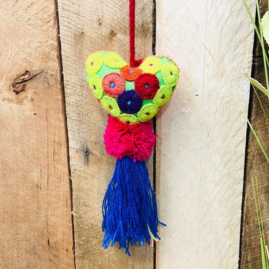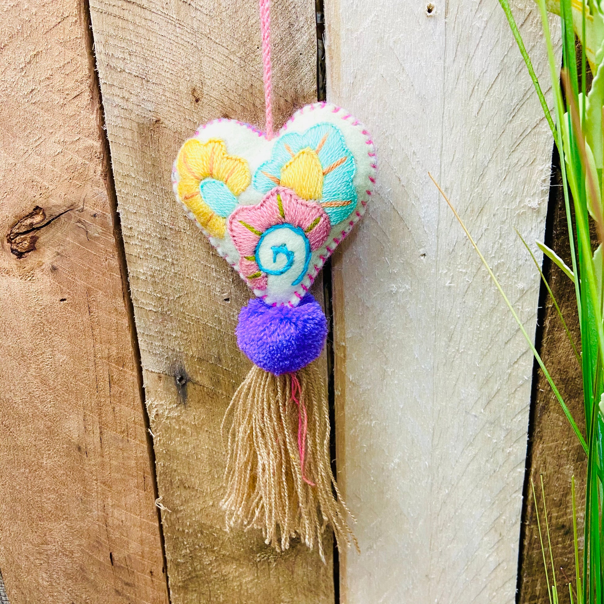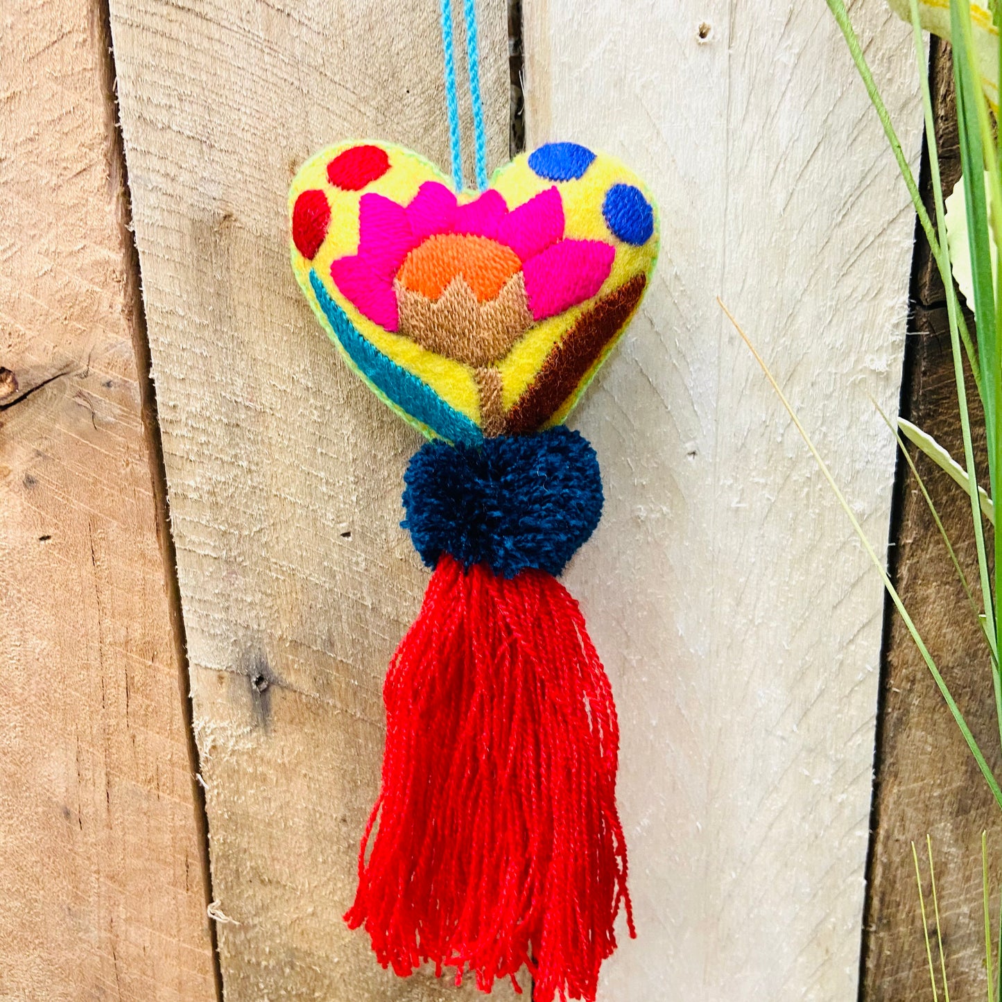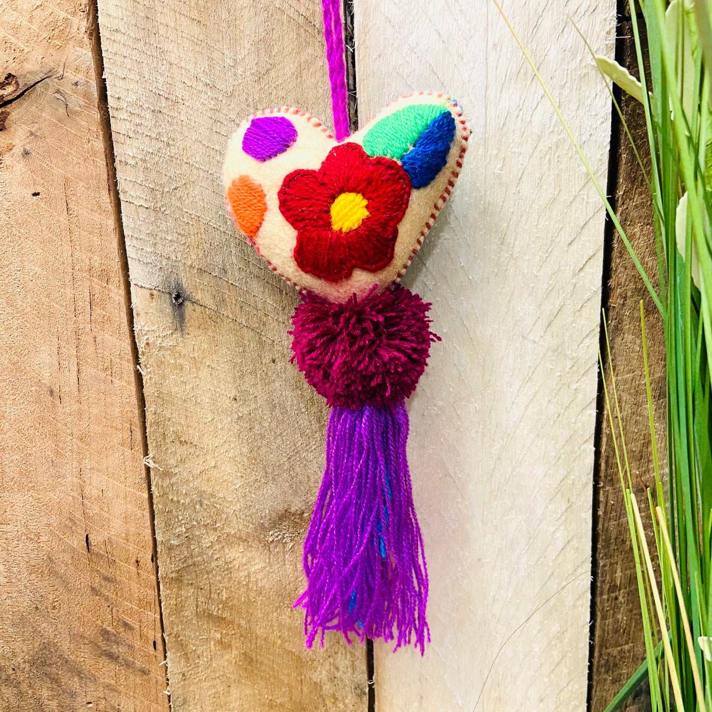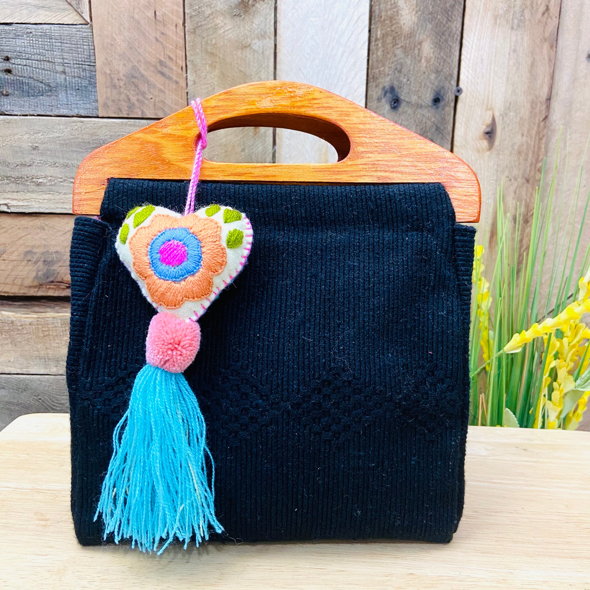 Super cute pom pom! Each piece is saw by hand with care and love by our artisans from Chiapas, Mexico. The colors and designs are inspired on Mexico's culture. Each is truly one of a kind!