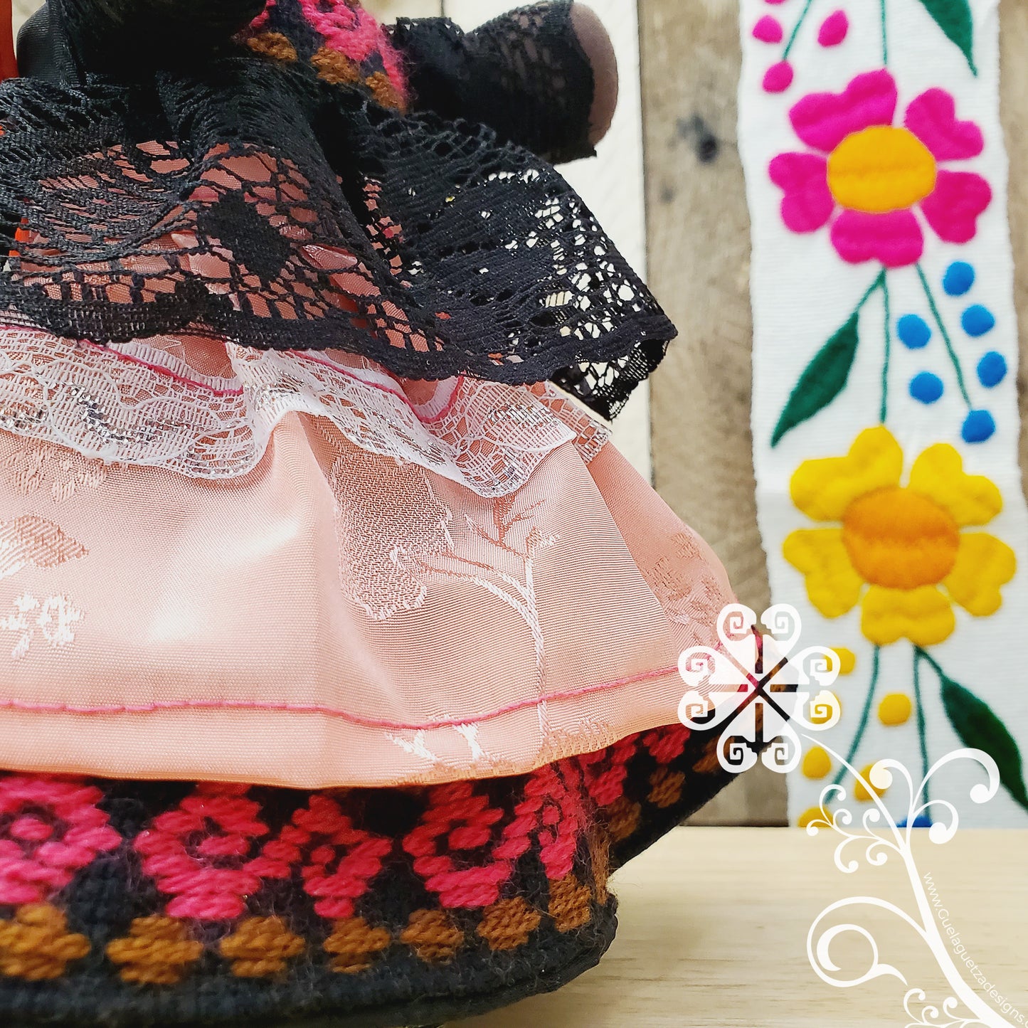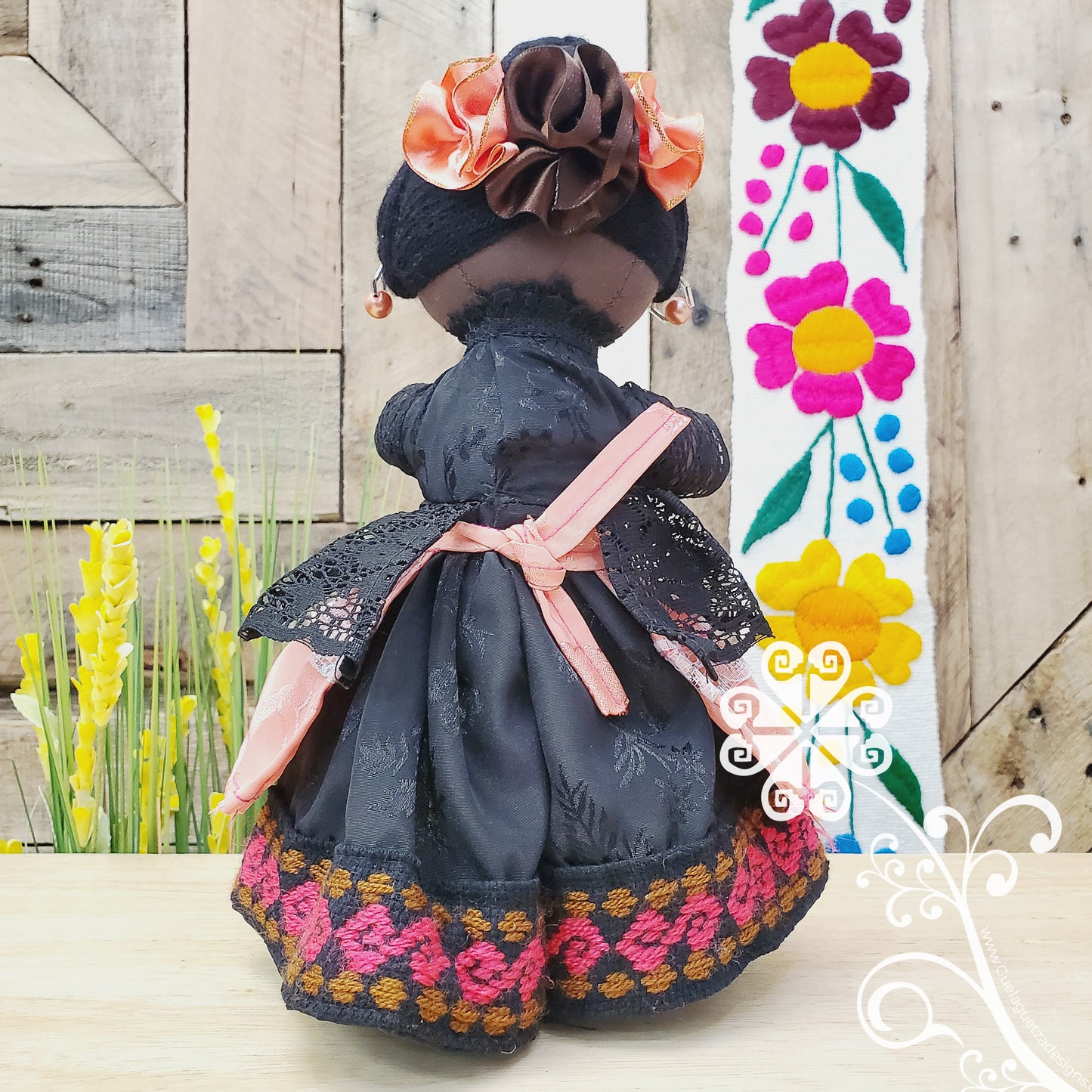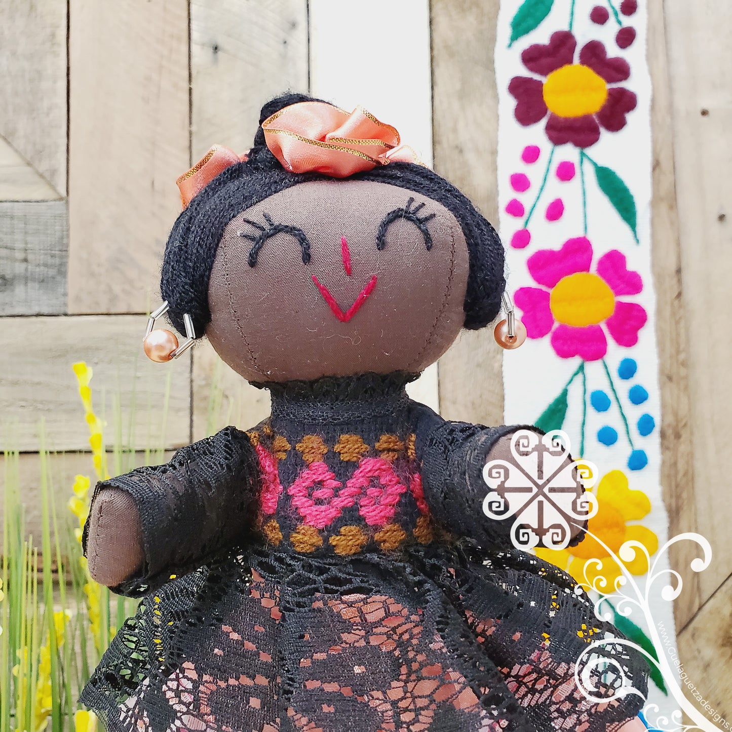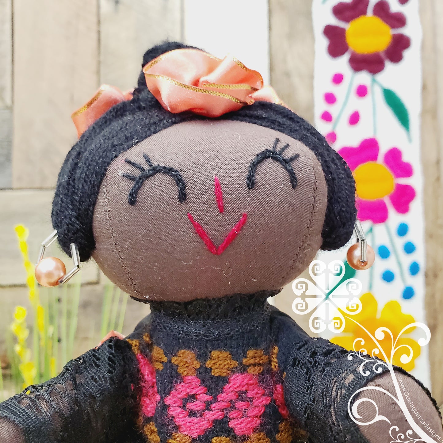 Her dress inspired on the otomi culture, delicate embroider flowers and shapes on the skirt and top, cotton lace, and a removable apron. This doll is inspired on the beautiful mulato skin color, her head features a beautiful hair bun and ribbon flowers, and her face factions are all handmade embroider.