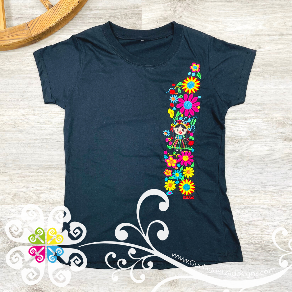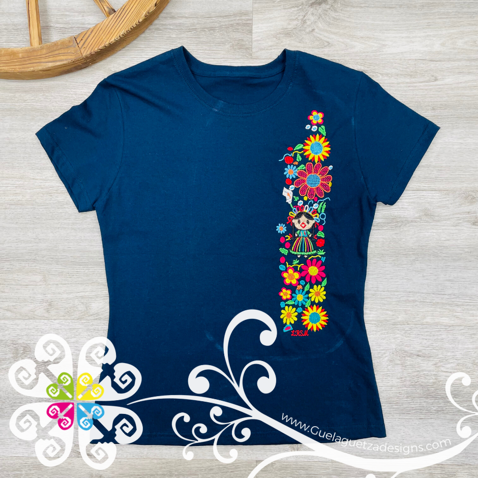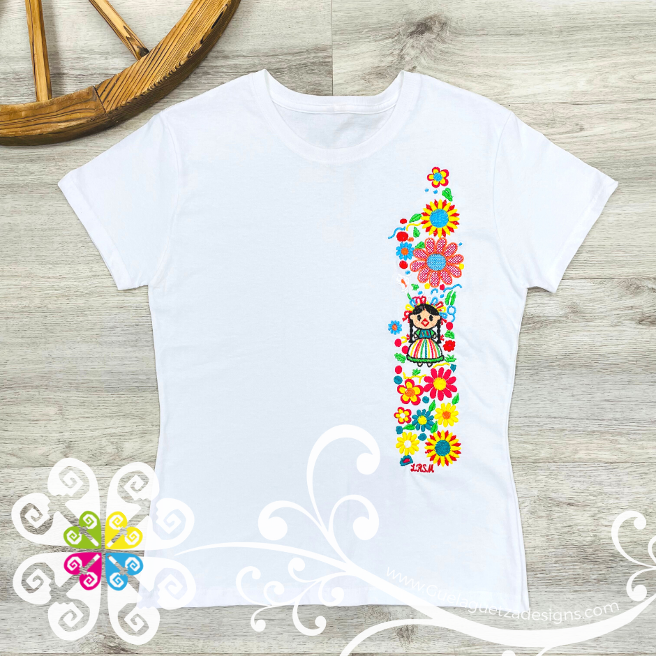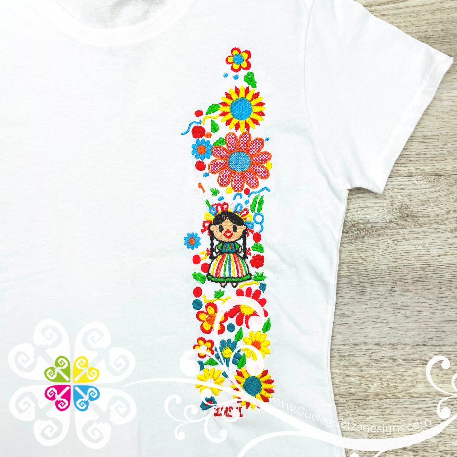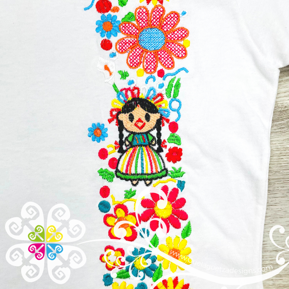 The machine embroider is inspired on the Mexican Otomi doll, decorated with multi color flowers. Embroider colors may vary from pictures.