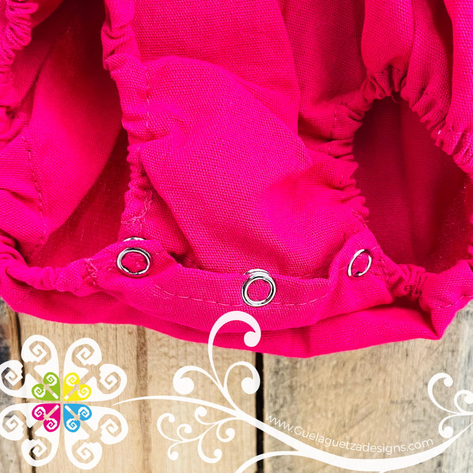 The most super cute onesie for your little princess, decorated with machine embroider on the ruffle. Fresh and comfortable design with elastic around the waist. Made with 'manta' and decorated cotton lace. Snap buttons in the bottom for easy access to change diapers. Embroidery colors may vary.