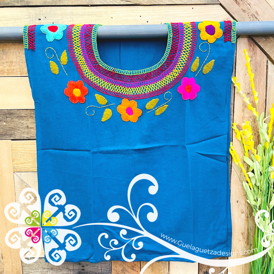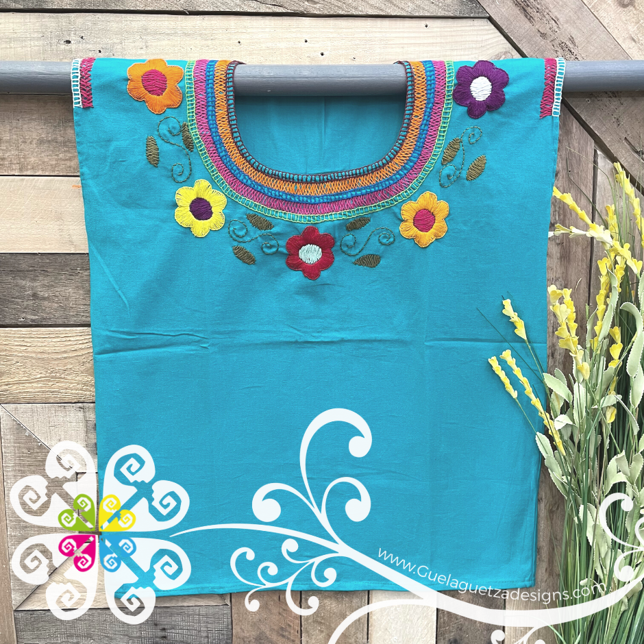 The neck is decorated with handmade embroider made with cotton threads. You will love the half moon design around the neck following by multicolor flowers. Matching embroider on sleeves. Fabric is 100% cotton. Once size available, fits small - medium.
