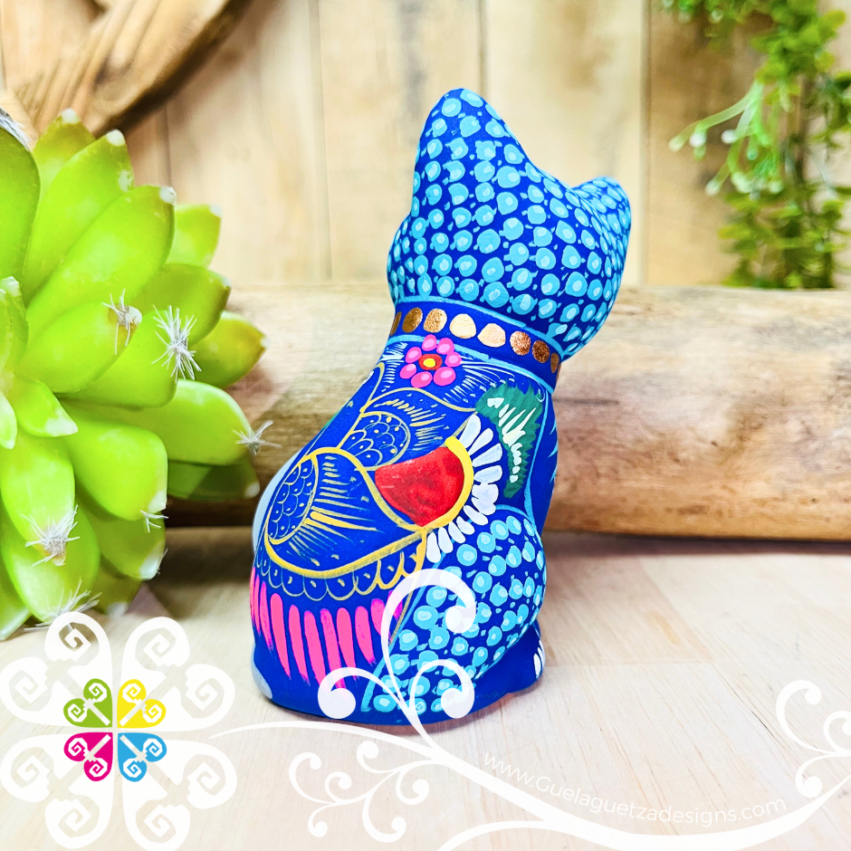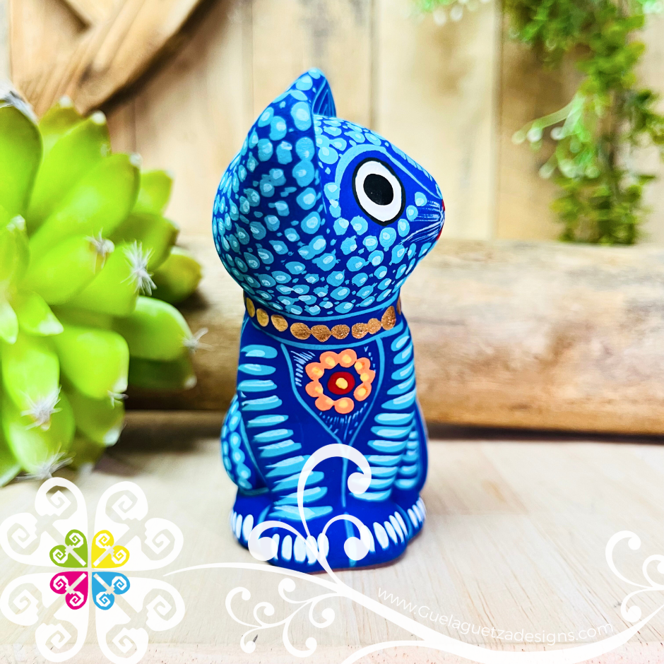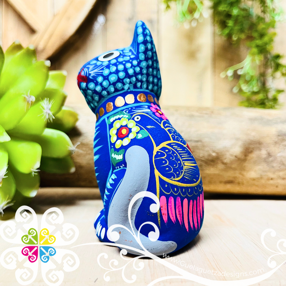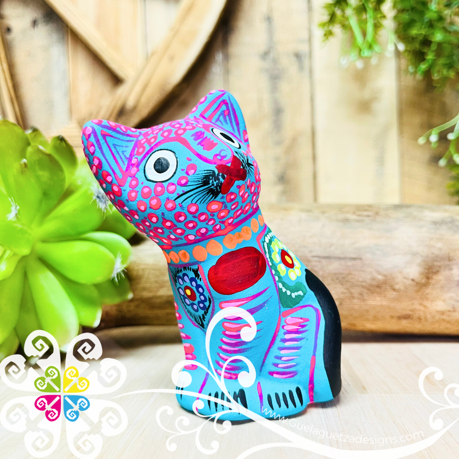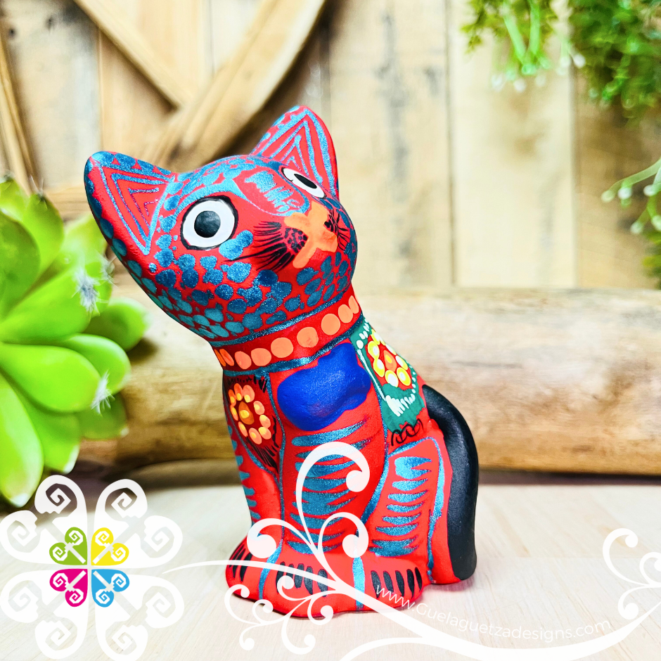 Beautiful hand painted clay cat from Guerrero, Mexico. Perfect piece to decor any small space from your house or office. Each design is very unique, colors may vary slightly from the pictures.