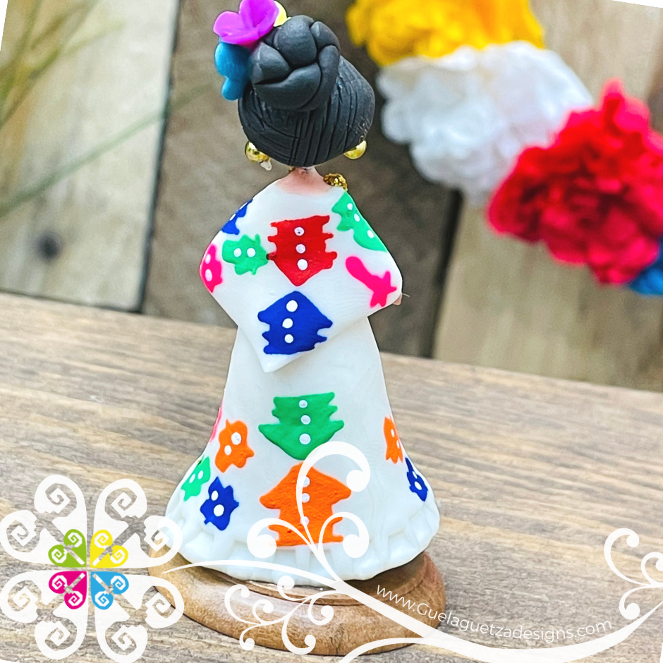 Beautiful miniature figurine doll handmade from fondant. Round base made of wood. You will love every detail from head to toe. Perfect for small spaces in need of a pop of color!
