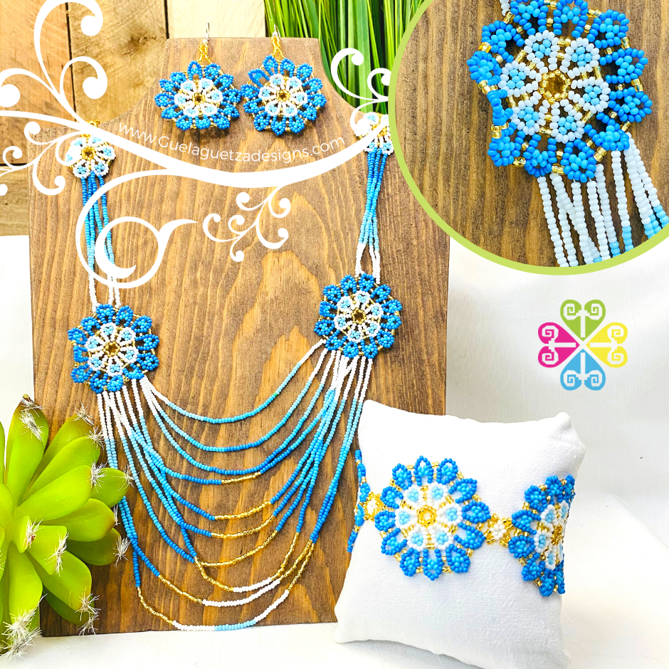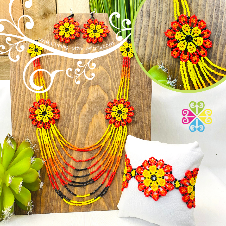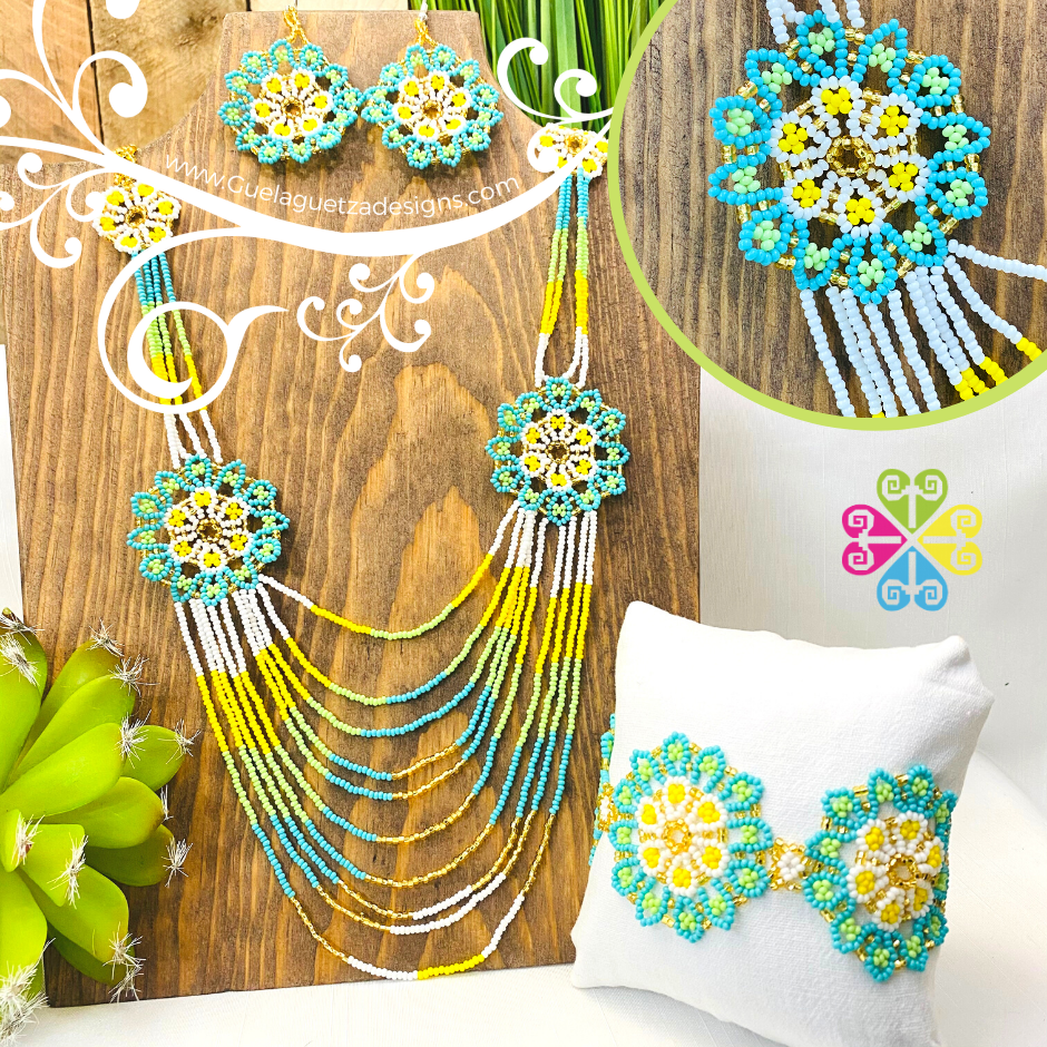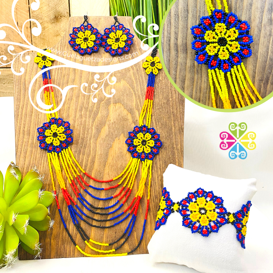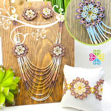 Beautiful 3 piece set that includes matching earrings, necklace and bracelet so you look amazing next time you go out. Each design is made with petite glass beads, featuring super cute flower designs made with different colors that can go from vibrant rainbow palette or just subtle tones.