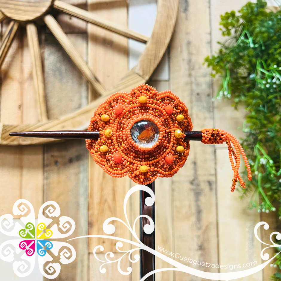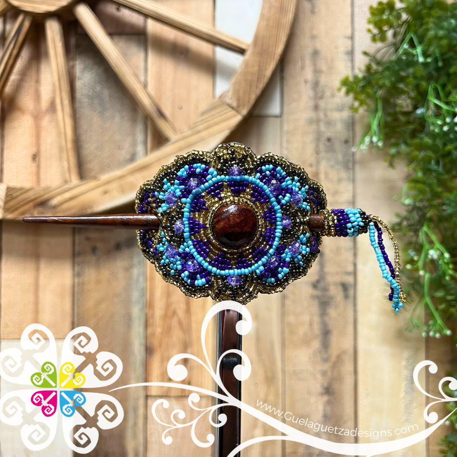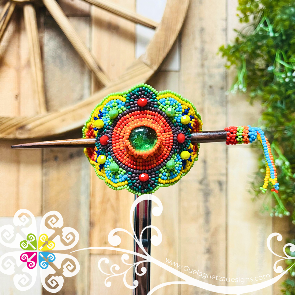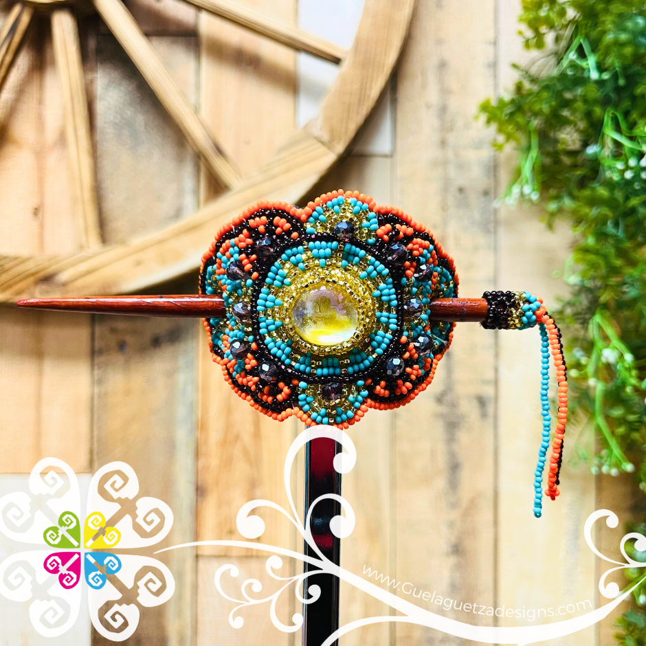 Stick is made from wood and decorated with matching petite beads from the main brooch. Perfect to lift up you hair during hot days.