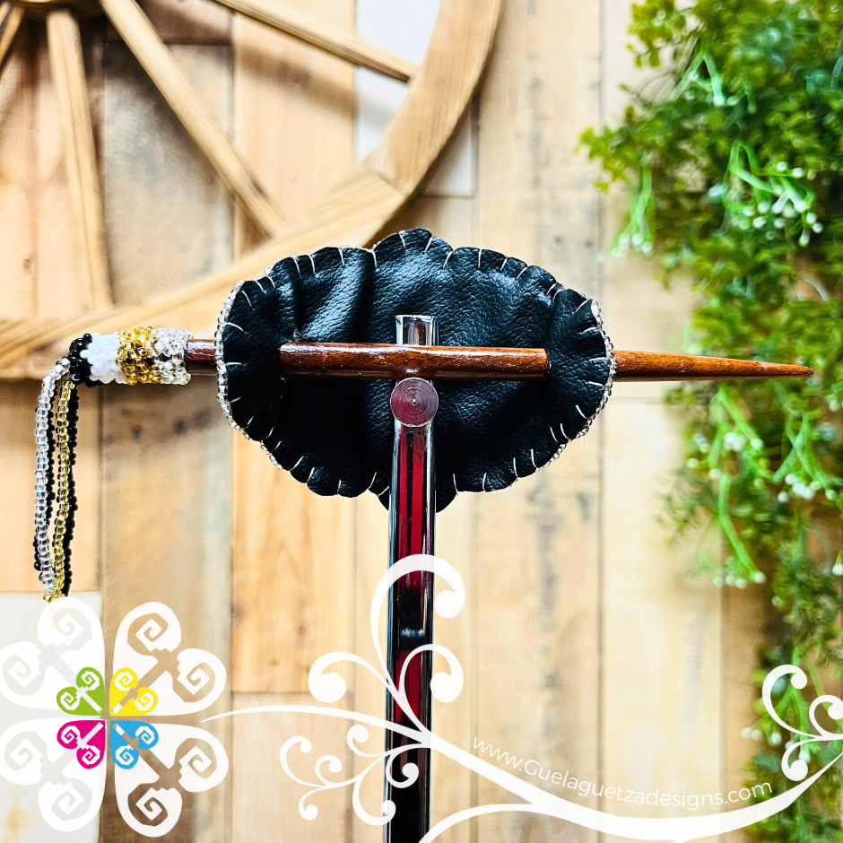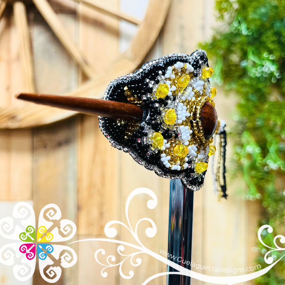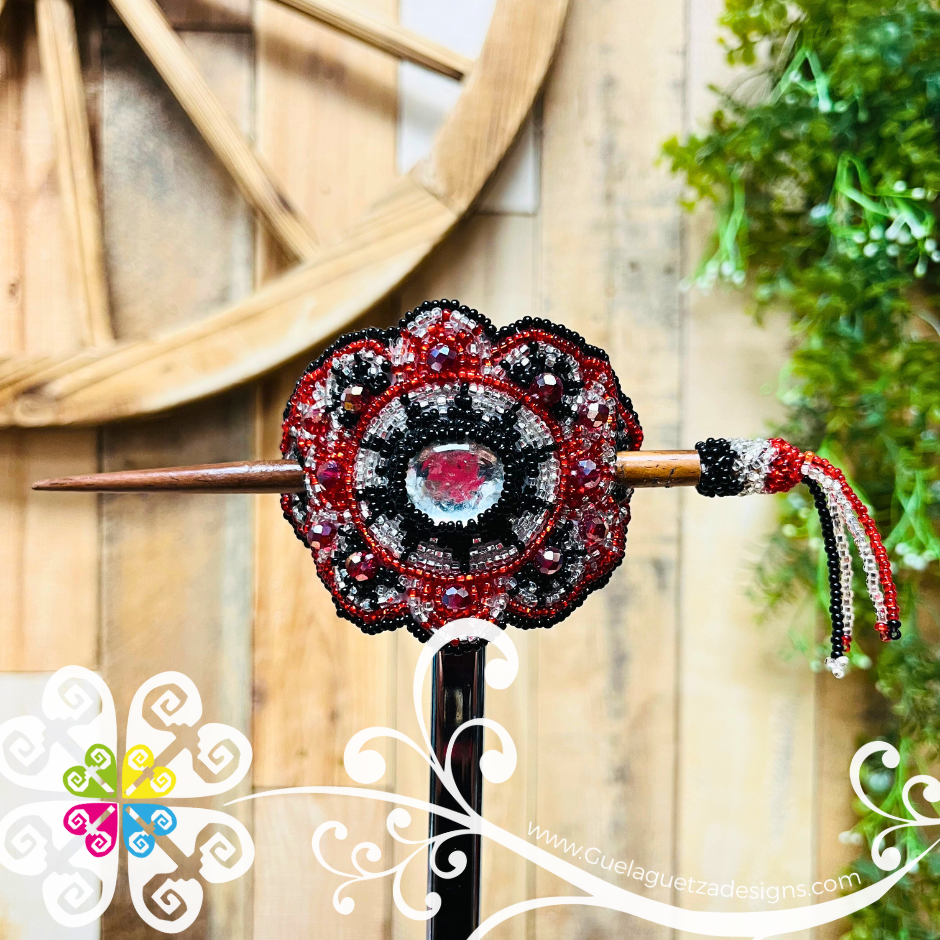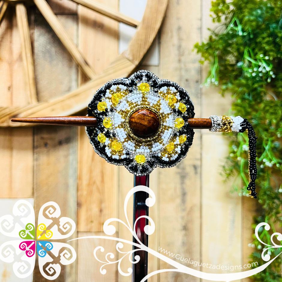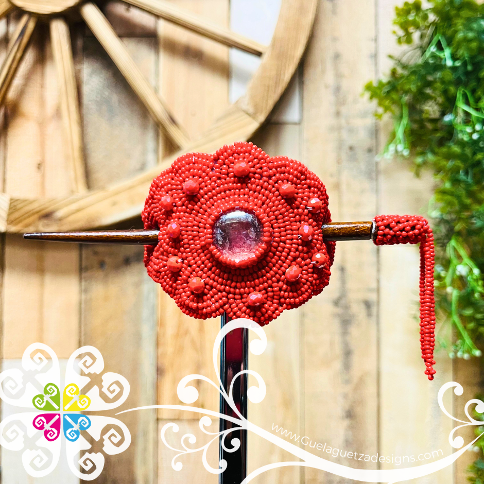 Stick is made from wood and decorated with matching petite beads from the main brooch. Perfect to lift up you hair during hot days.