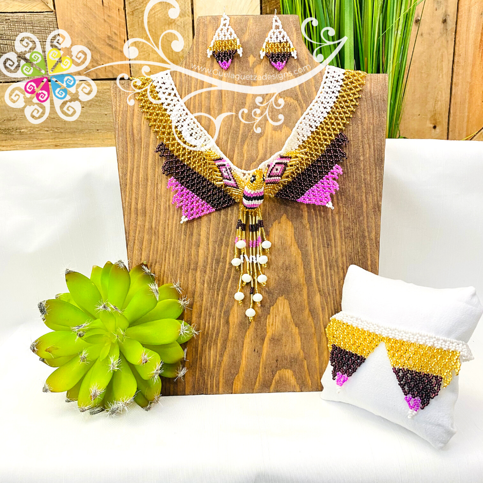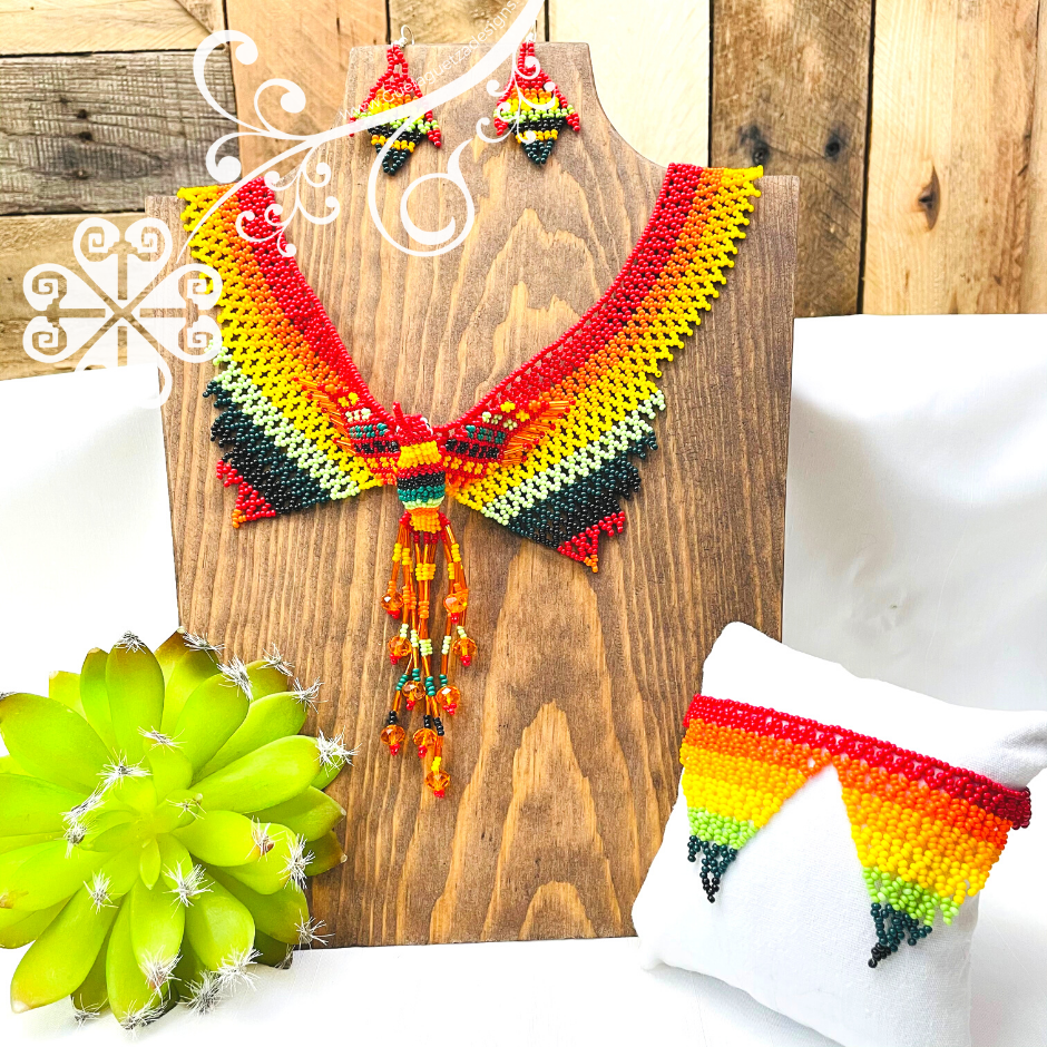 Beautiful 3 piece set that includes matching earrings, necklace and bracelet so you look amazing next time you go out. Each design is made with petite glass beads, featuring super cute flower designs made with different colors that can go from vibrant rainbow palette or just subtle tones.