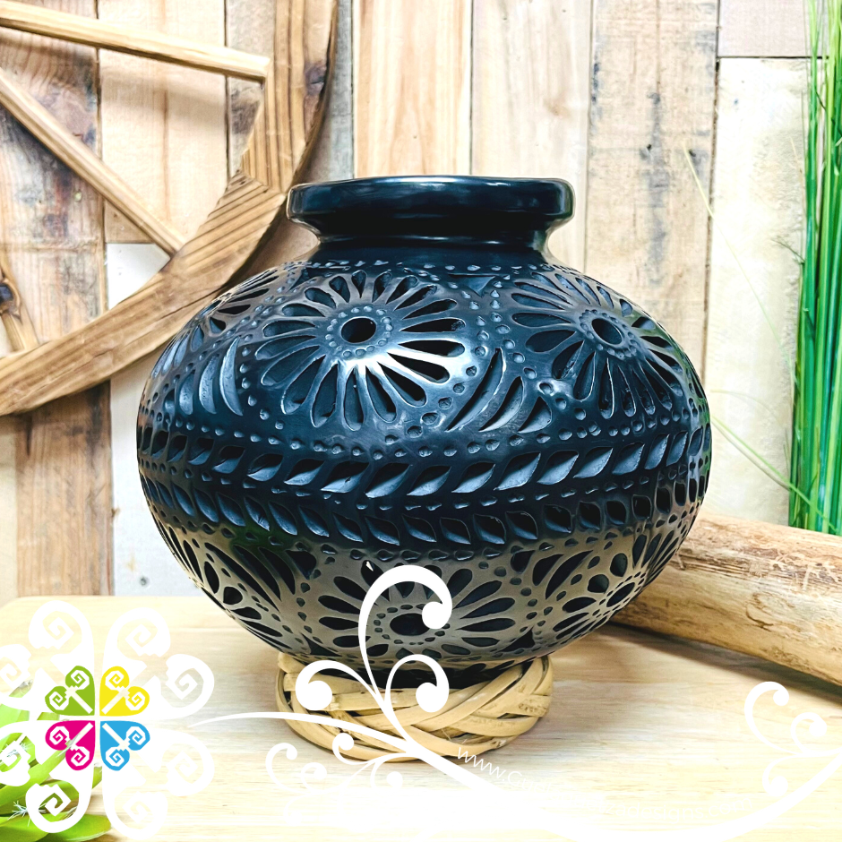 Beautifully handcrafted vase with multiple uses. Use it to hold dry flowers, light a candle, or display just plain and elegant. Each piece is hand-crafted with care and love by the workshop from San Bartolo Coyotepec Oaxaca, Mexico.