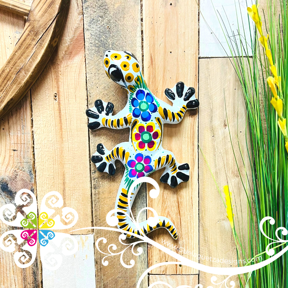 Beautiful clay lizards handcrafted by Mexican artisans from Michoacán, Mexico. Each design crafted and hand painted. Perfect decor for any space in your house.