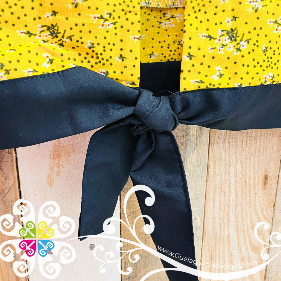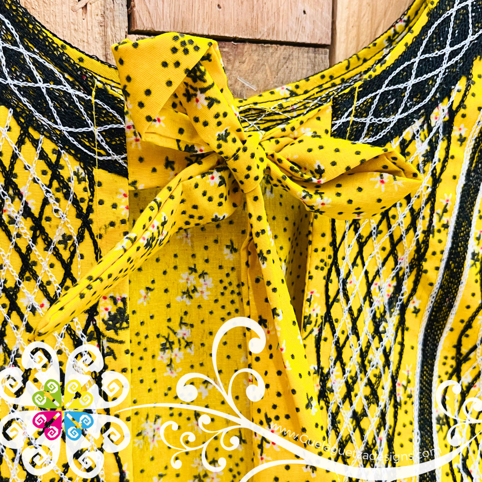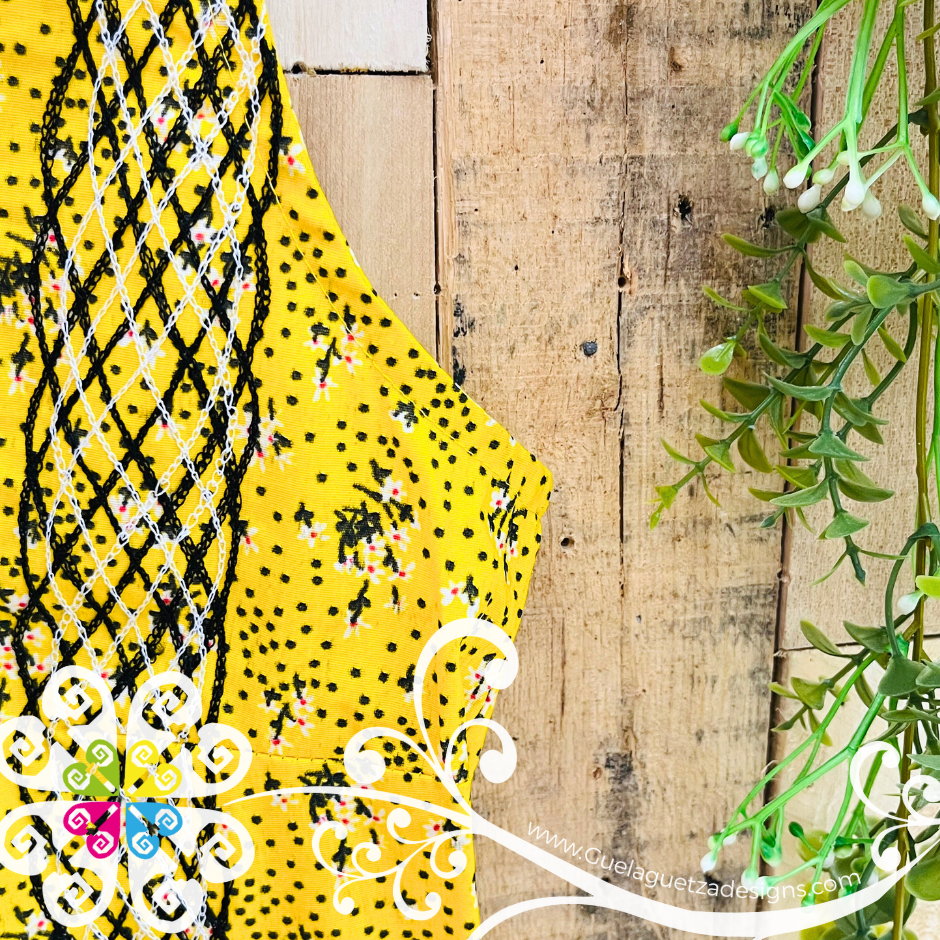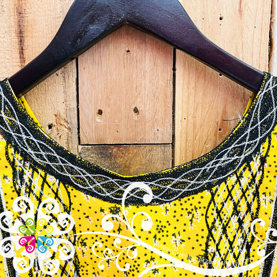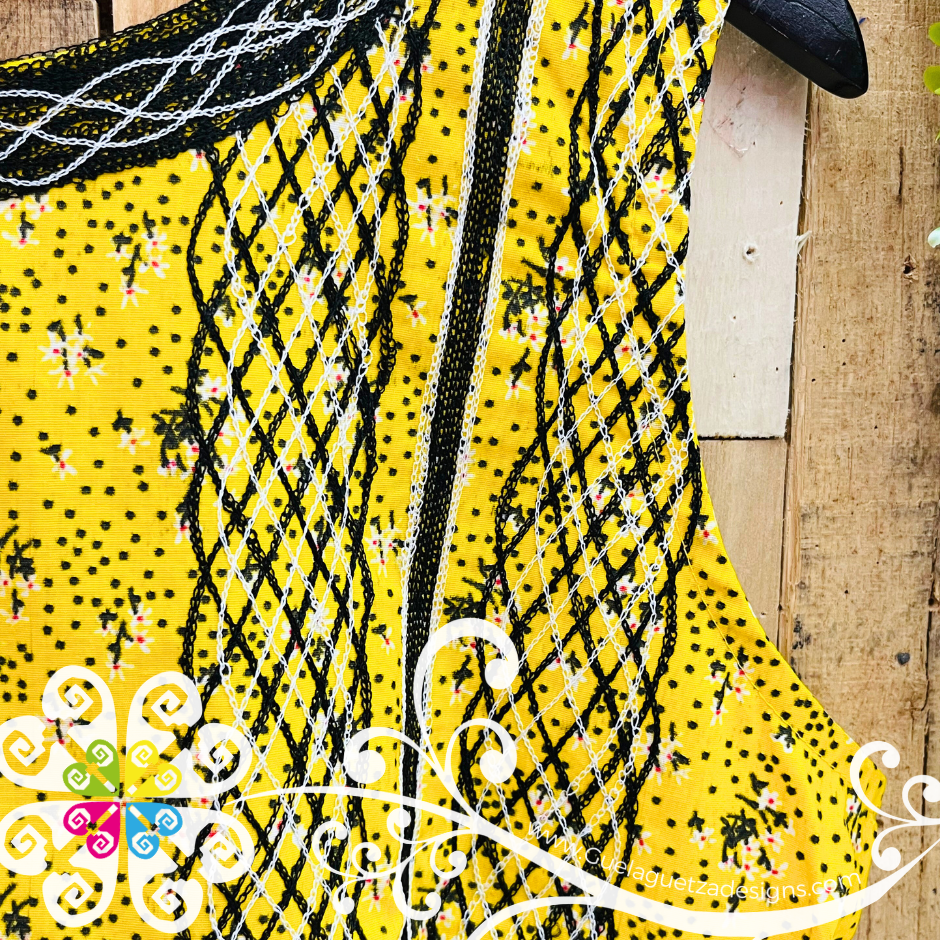 Elegant and authentic tehuana top made by local artisans from la costa de Tehuantepec, Oaxaca on pedal sewing machine embroider. The top features beautiful geometrical shapes and flower designs embroidered on both front and back. The fabric features an open back with fabric lace so you can customize the fit of this top.