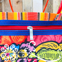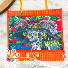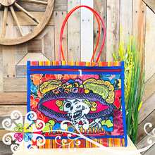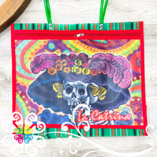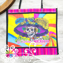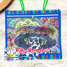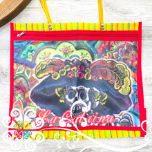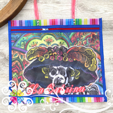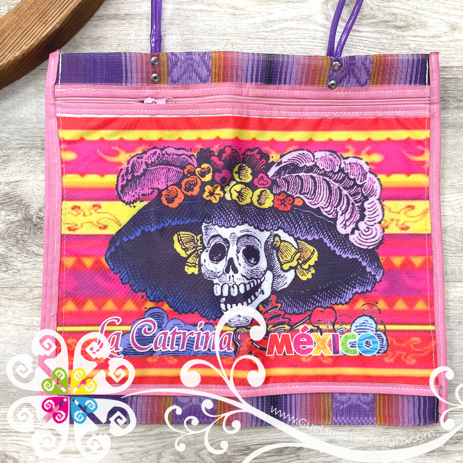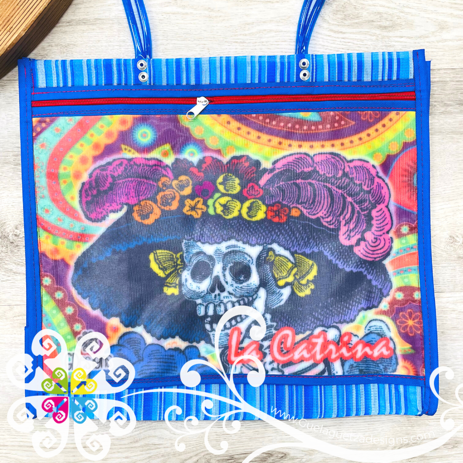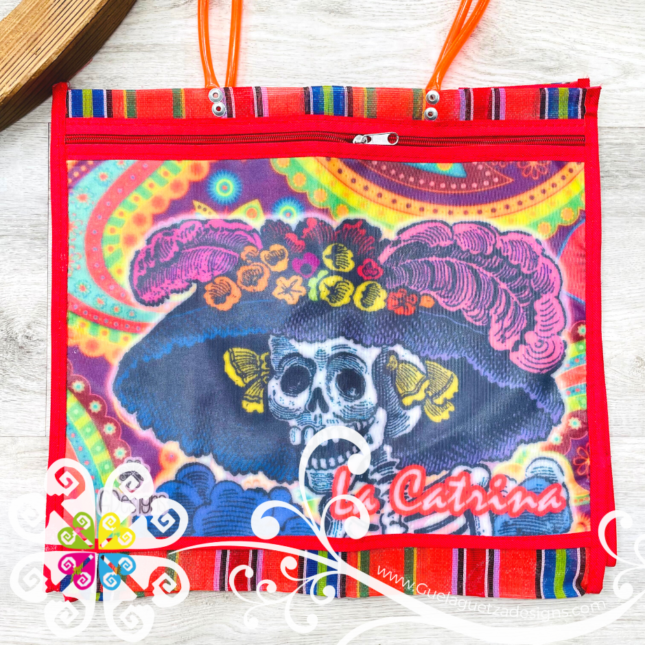 Inspired on the Mexican holiday Dia de Muertos! Morral made with mesh material, front large pocket with zipper to secure your belongings. Very resistant material, water proof! Perfect for grocery shopping, beach bag, laptop bag or just about anything!