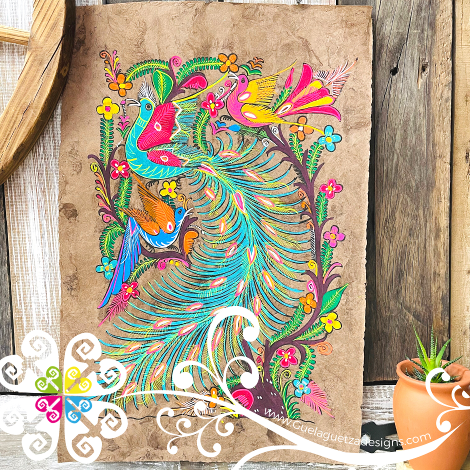 Handmade paintings from Guerrero, Mexico on ‘amate’ paper; a natural sheet made with techniques that go back to the pre-Hispanic Mexico. Each painting is unique, with colorful designs of the flora and fauna from artisan's region.