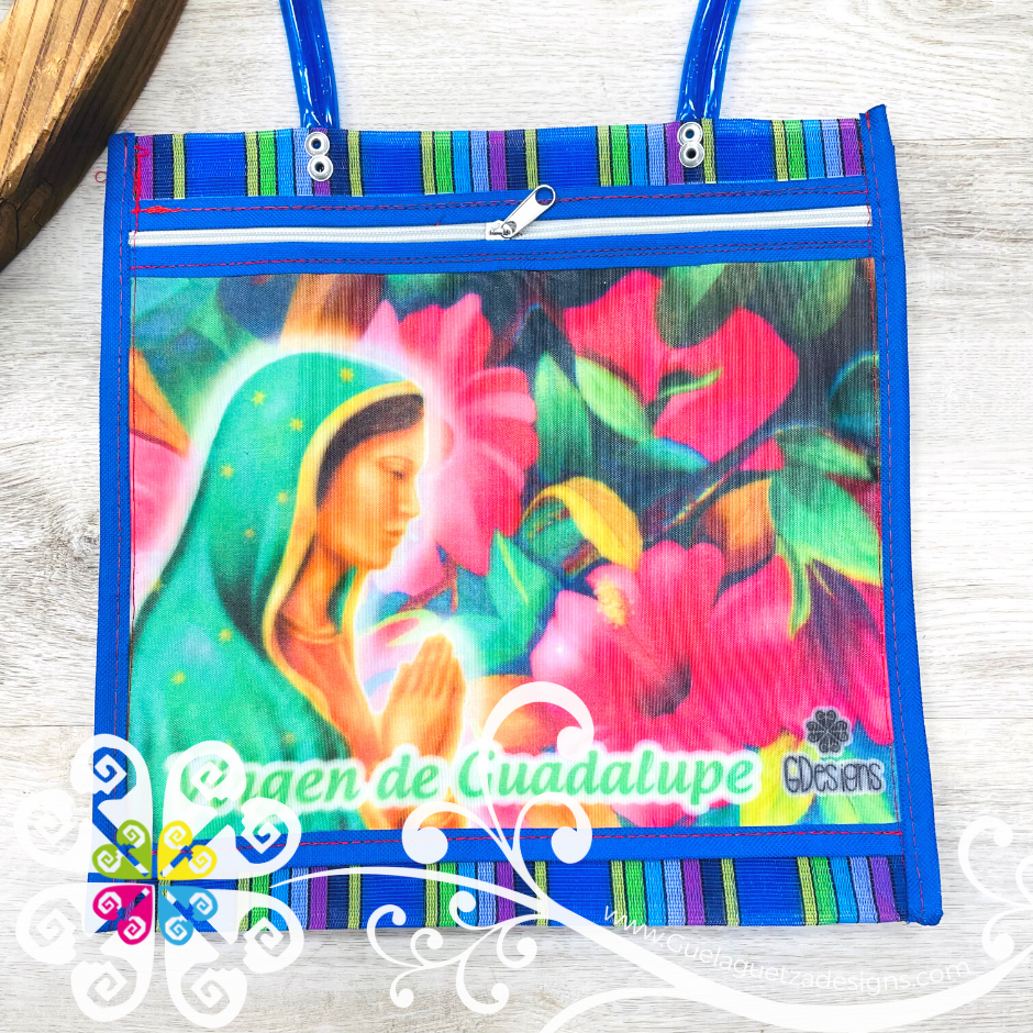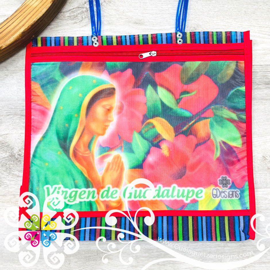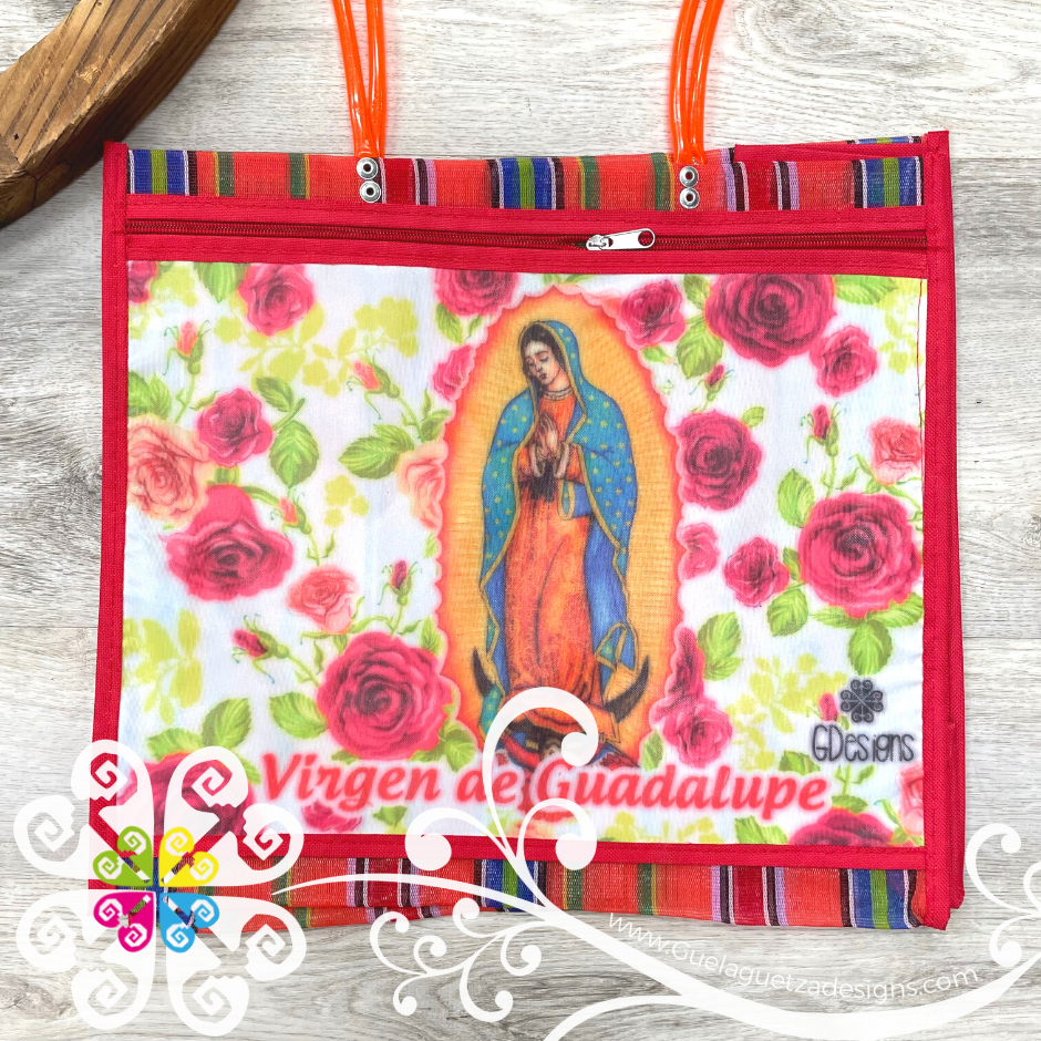 Inspired on the Virgen de Guadalupe! Morral made with mesh material, front large pocket with zipper to secure your belongings. Very resistant material, water proof! Perfect for grocery shopping, beach bag, laptop bag or just about anything!