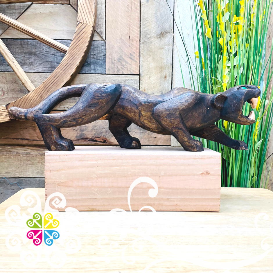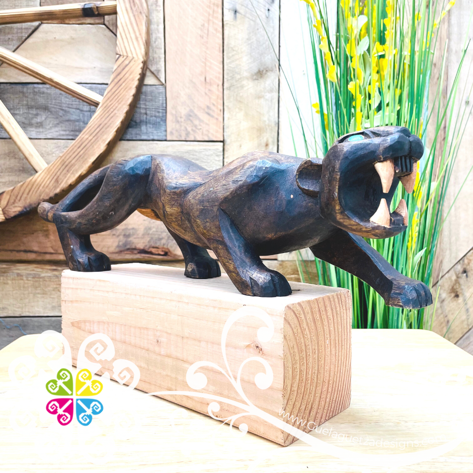 Beautiful and elegant jaguar figure from the Mayan Culture. Hand carved by artist from Tinum, Yucatán. The Jaguar is consider the ruler of the underworld for Mayan culture, you are getting a very unique art and support Mexican small workshop from Tinum.