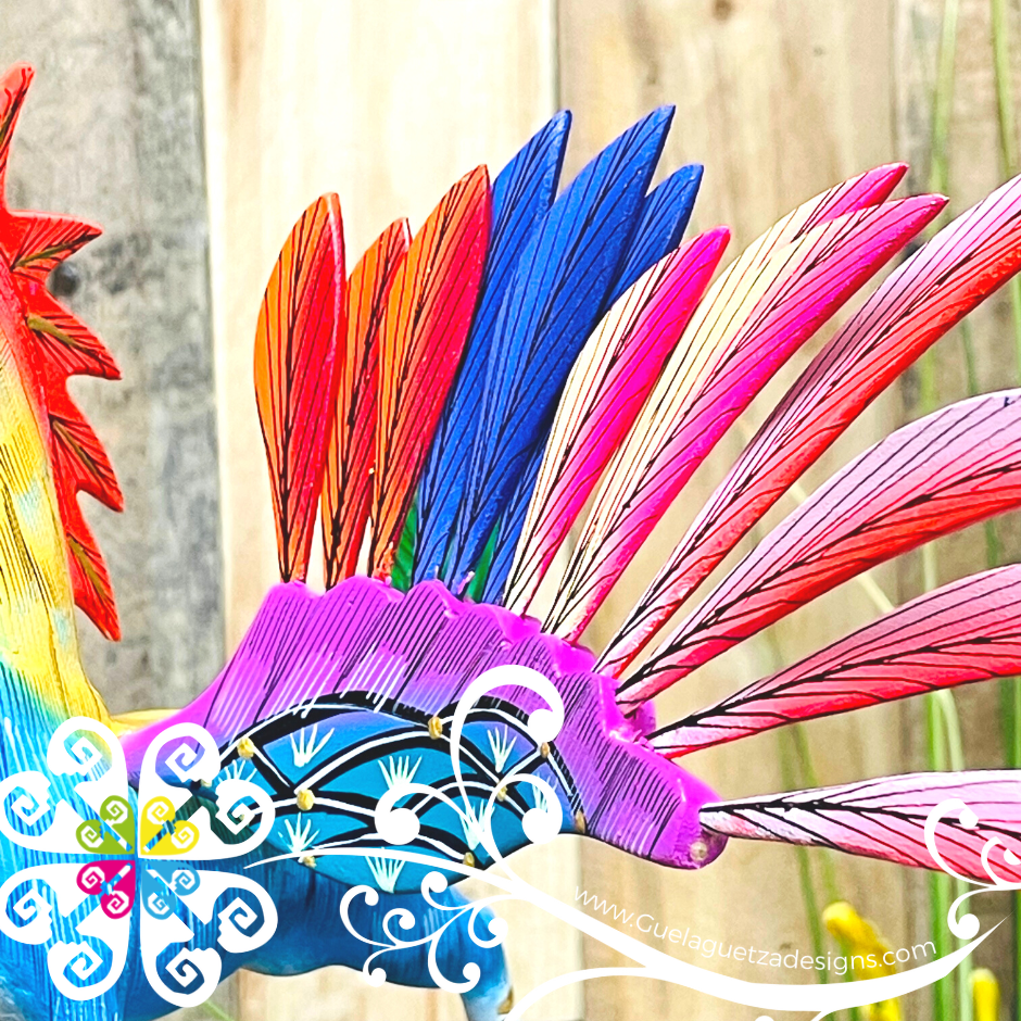 One of a kind hand carved wooden figures made by workshop "Sueño Profundo" located in Zaachila, Oaxaca. Each piece is inspired by the cultural mosaic from Oaxacan indigenous groups. Nature’s elements such as sun, earth, water, wind, and fire are represented on each colorful design.