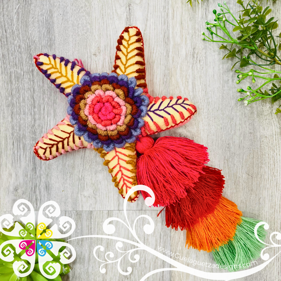 Super cute pom pom! Each piece is saw by hand with care and love by our artisans from Chiapas, Mexico. The colors and designs are inspired on Mexico's culture. Each is truly one of a kind!