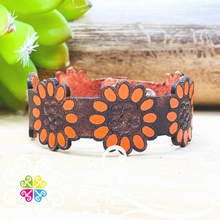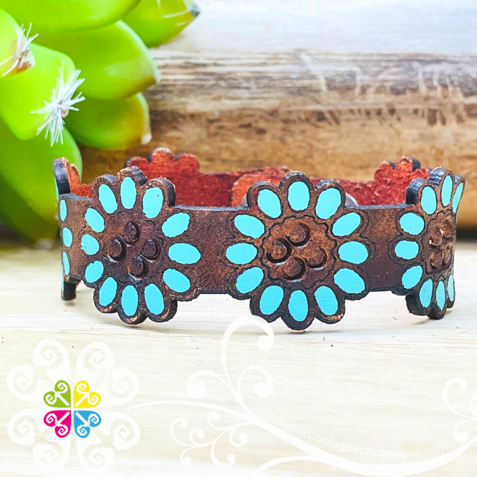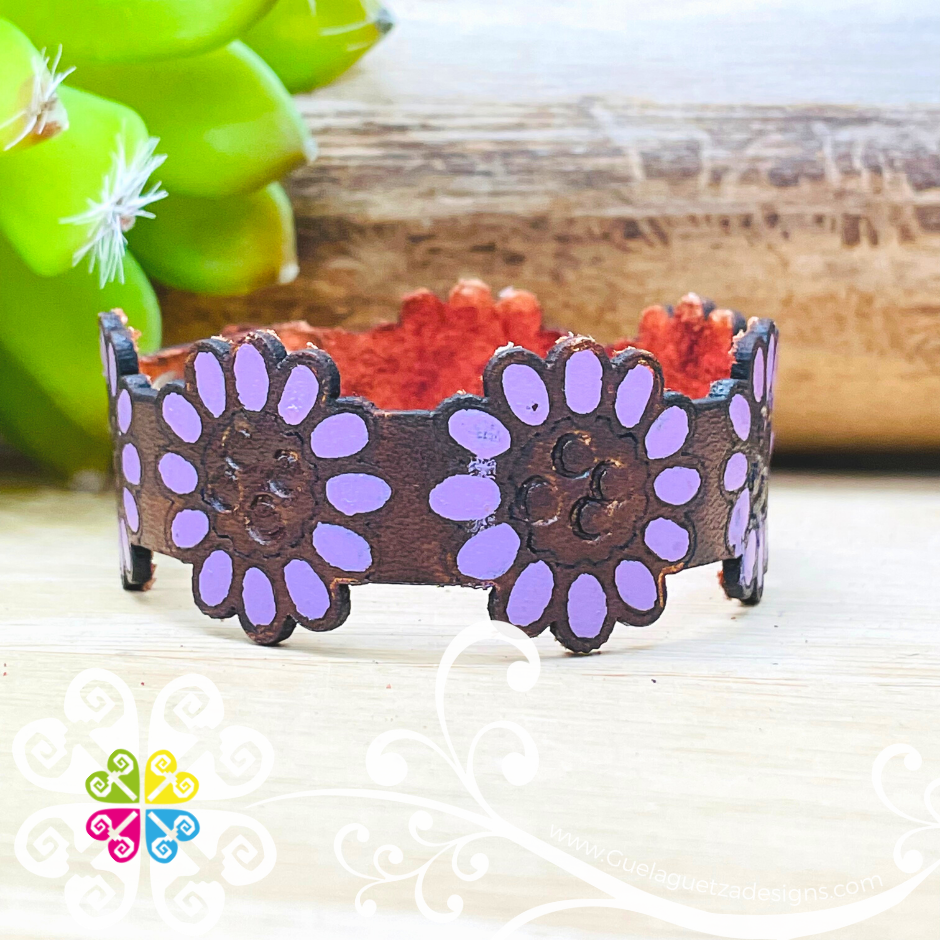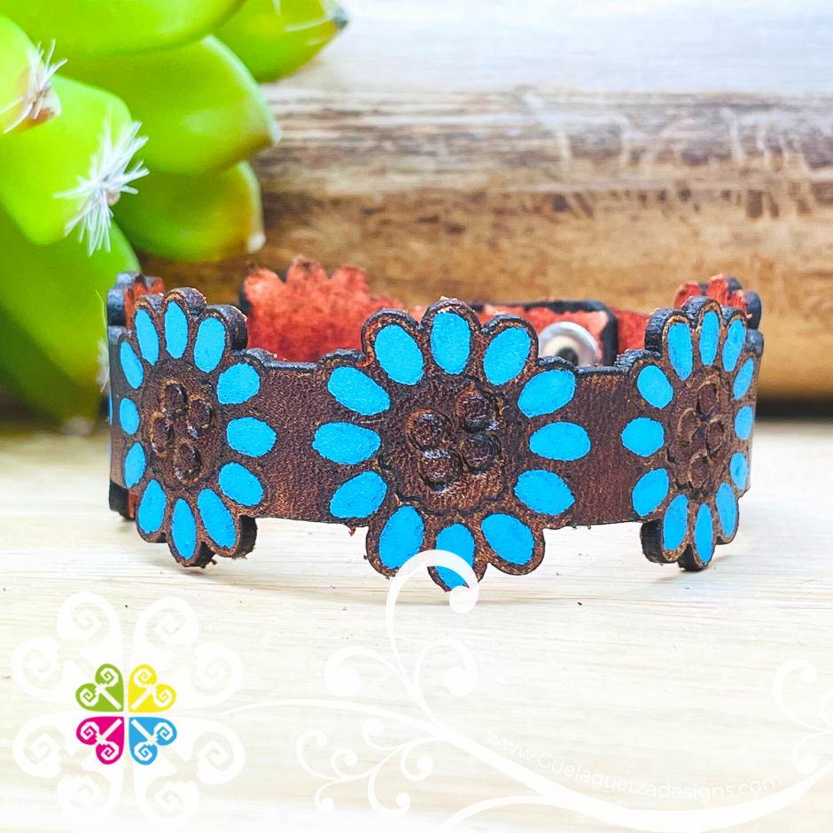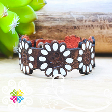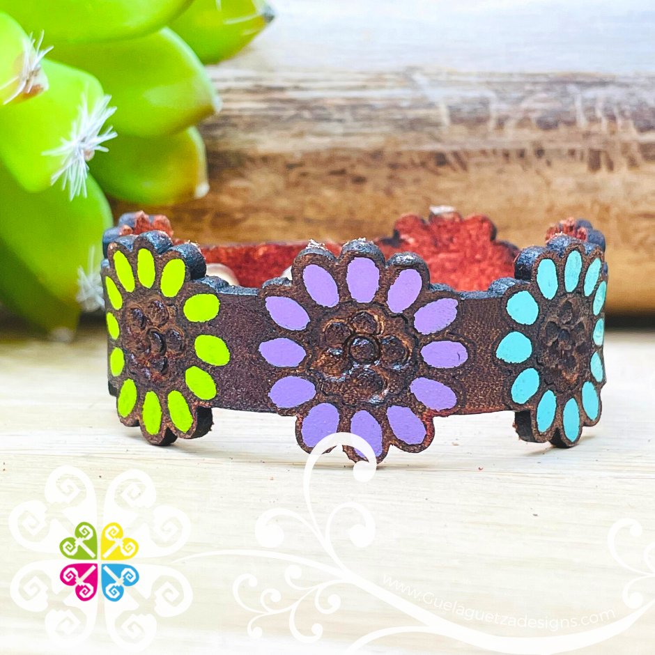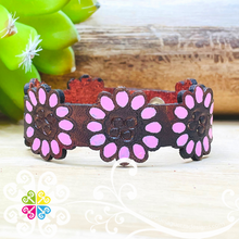 100% cowhide leather bracelet decorated with hand-painted flowers using acrylic paint. Two snap bottoms to adjust to your wrist.