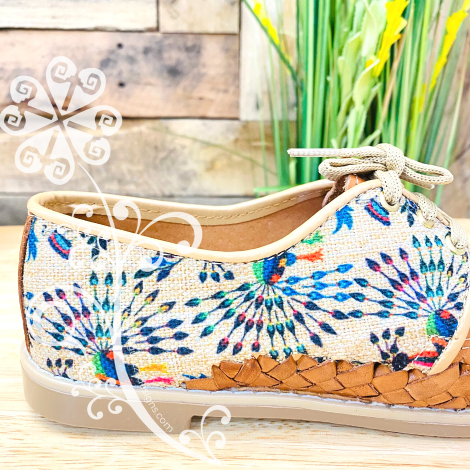 Artisan shoes made with 100% bovine leather for the exterior and inside sole. Decorated with unique resist jute artisan fabrics and the front features a beautiful "troquelado' design.