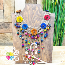 Necklace has tornasol beads and beautiful palm beads. This pieces is inspired by the colorful Mexican culture you'll grow to love.