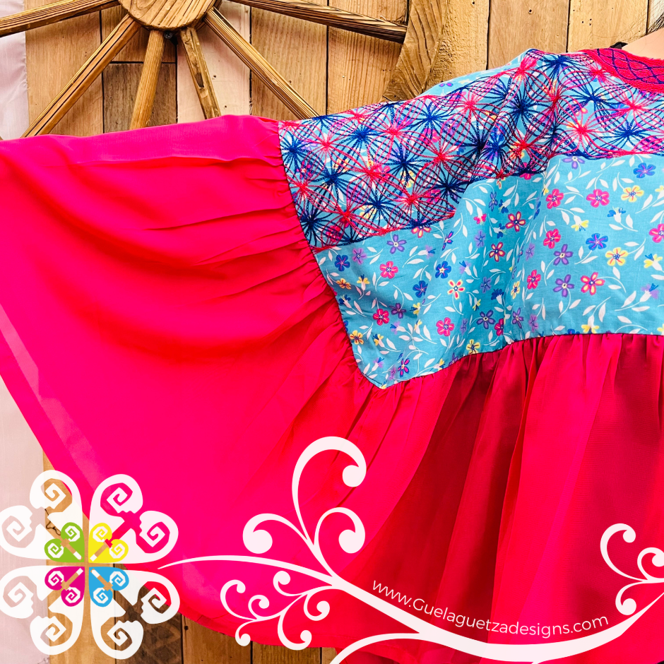 Elegant and authentic Tehuana top made by local artisans from La Costa de Tehuantepec, Oaxaca, on a pedal sewing machine, embroidered. The top features beautiful, geometric shapes and floral designs embroidered on both the front and back. This stunning top features a "V " neckline, flutter sleeves, and a button-up back to bring to life the stunning handmade piece!