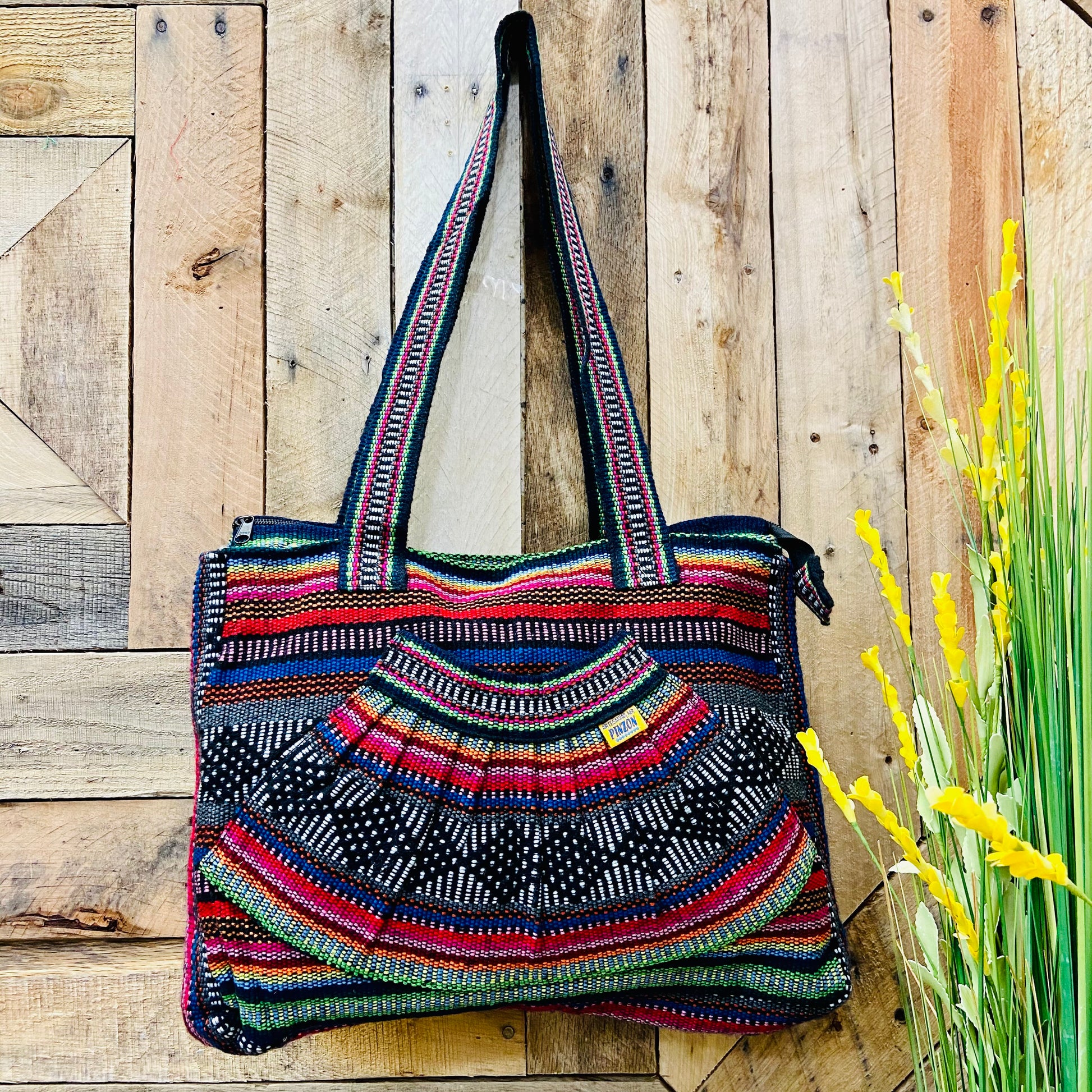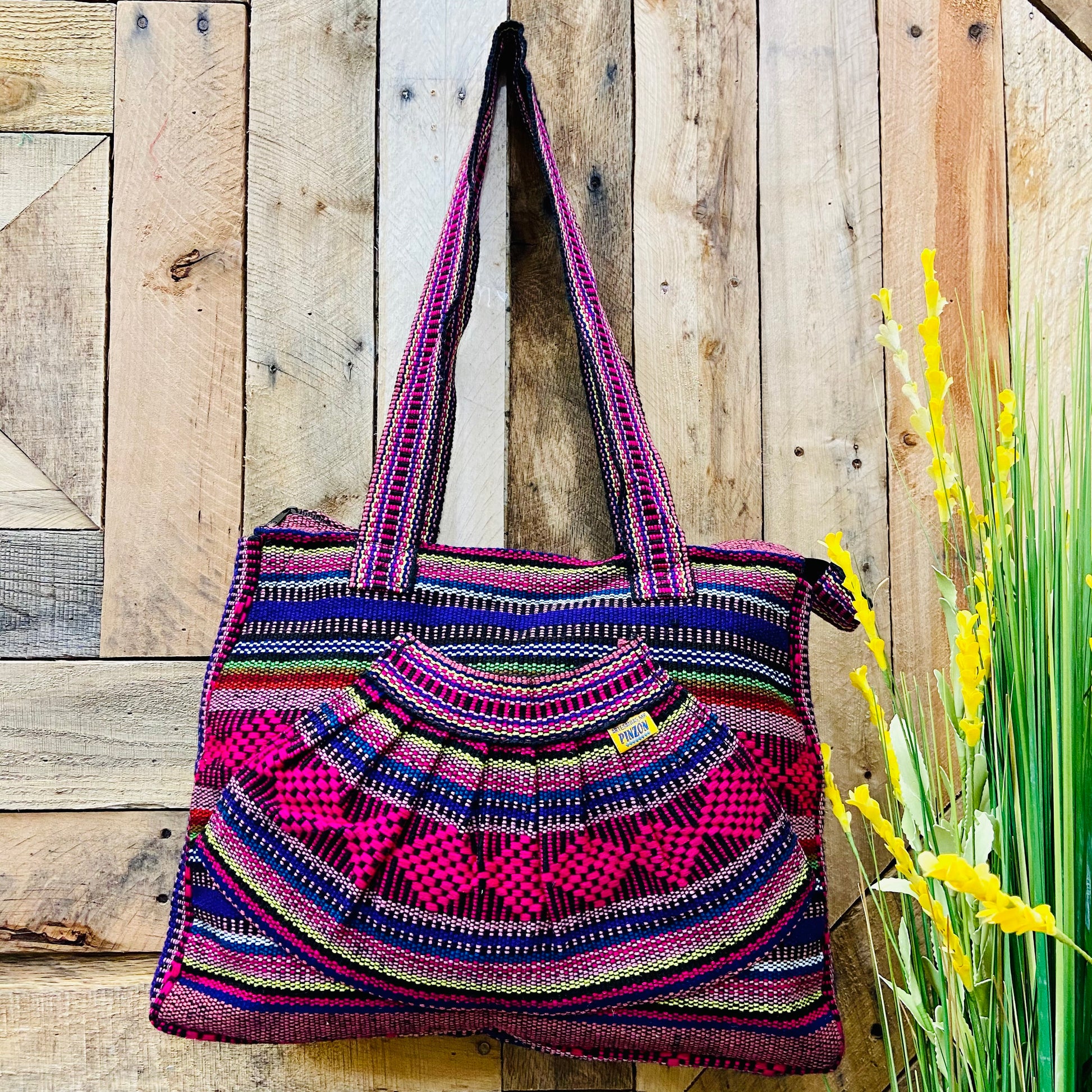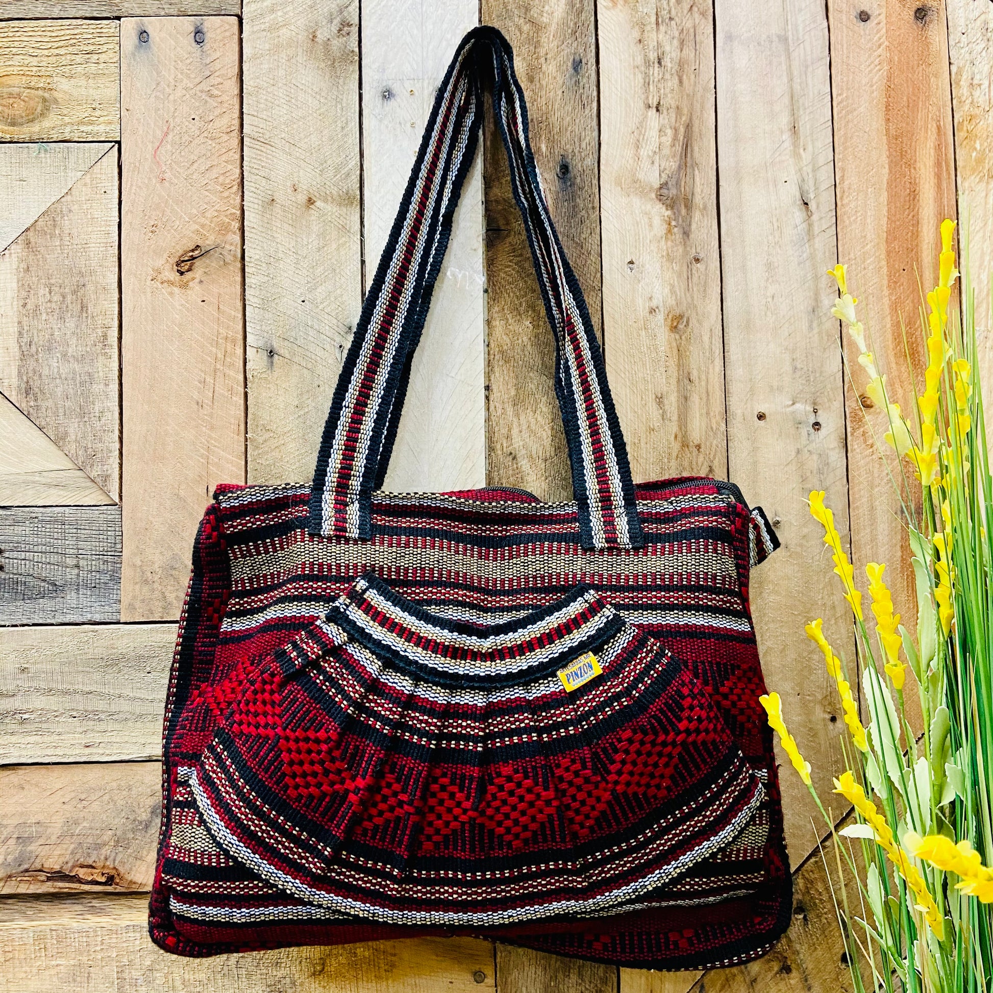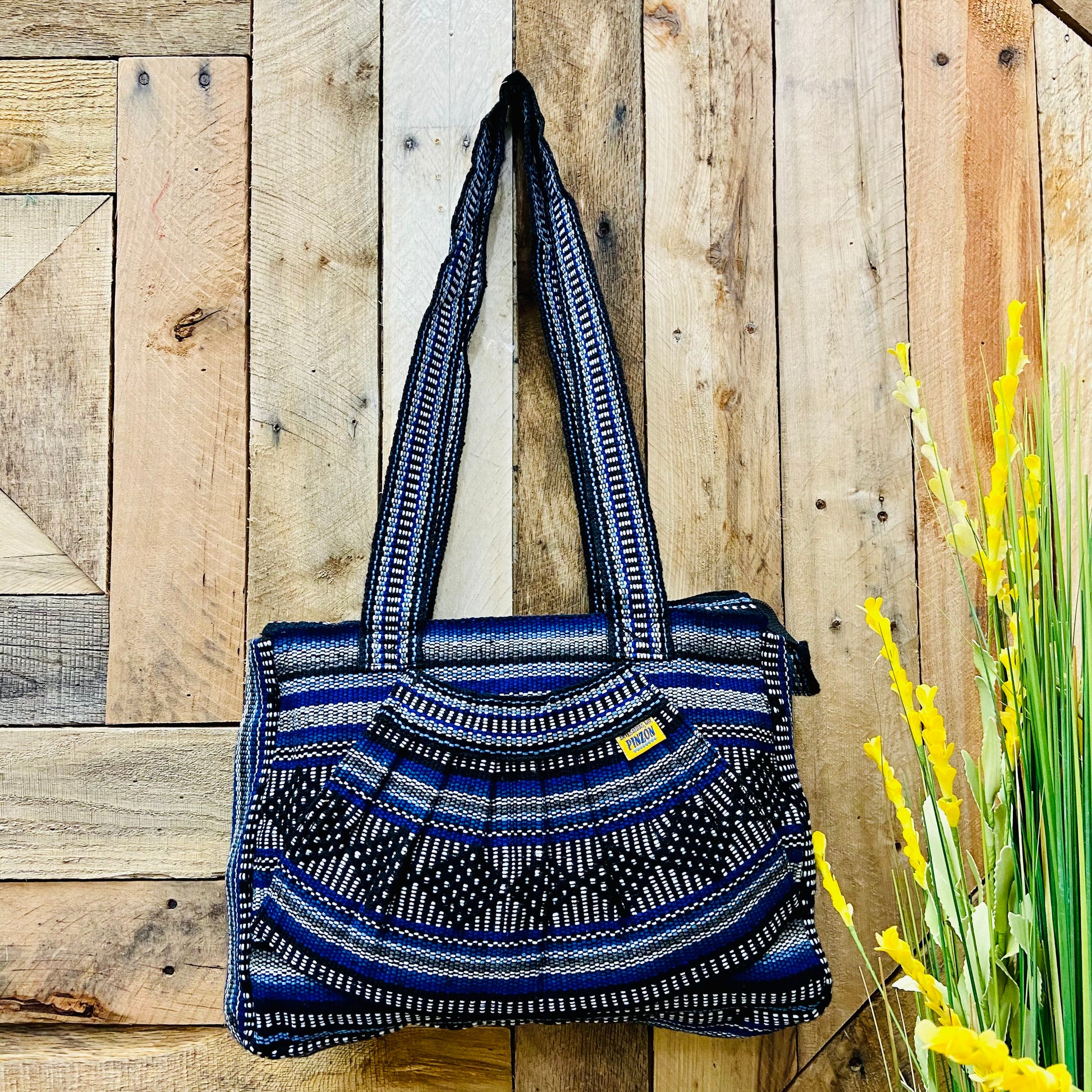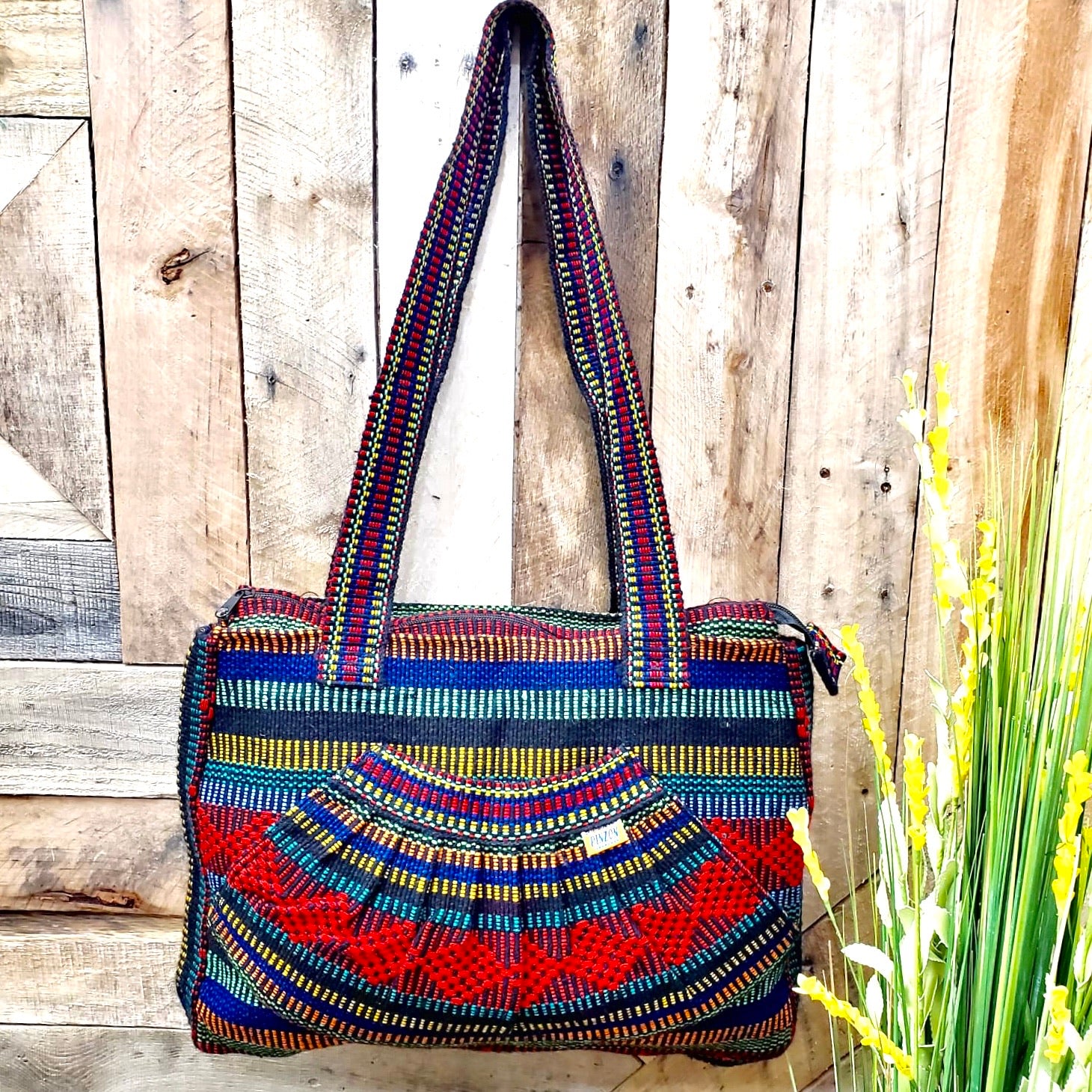 Elegant model with two handles to carry on the shoulder, upper closure to secure content, and a practical front pocket fan-shaped.