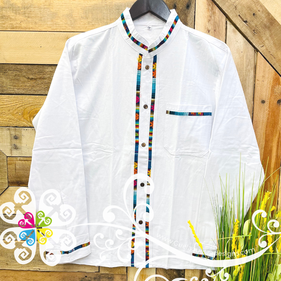 Traditional men manta shirt made with industrial fabric 100% cotton. Neck, end of sleeves and front is decorated with ‘coralillo’; colorful lace that gives it the perfect Mexican touch.