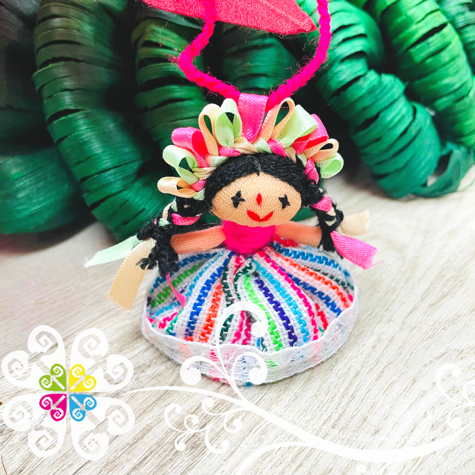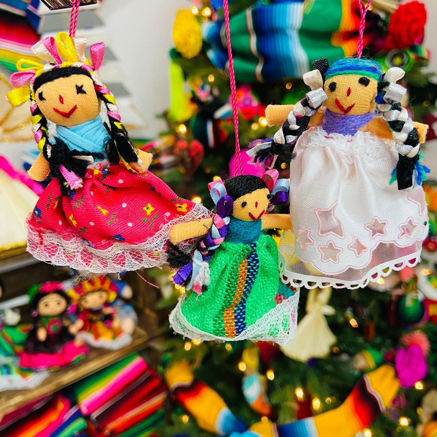 This package includes 10 handmade otomi doll, assorted styles and colors with a string ready to hang. Approximate size is 2.5 inches without the string