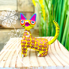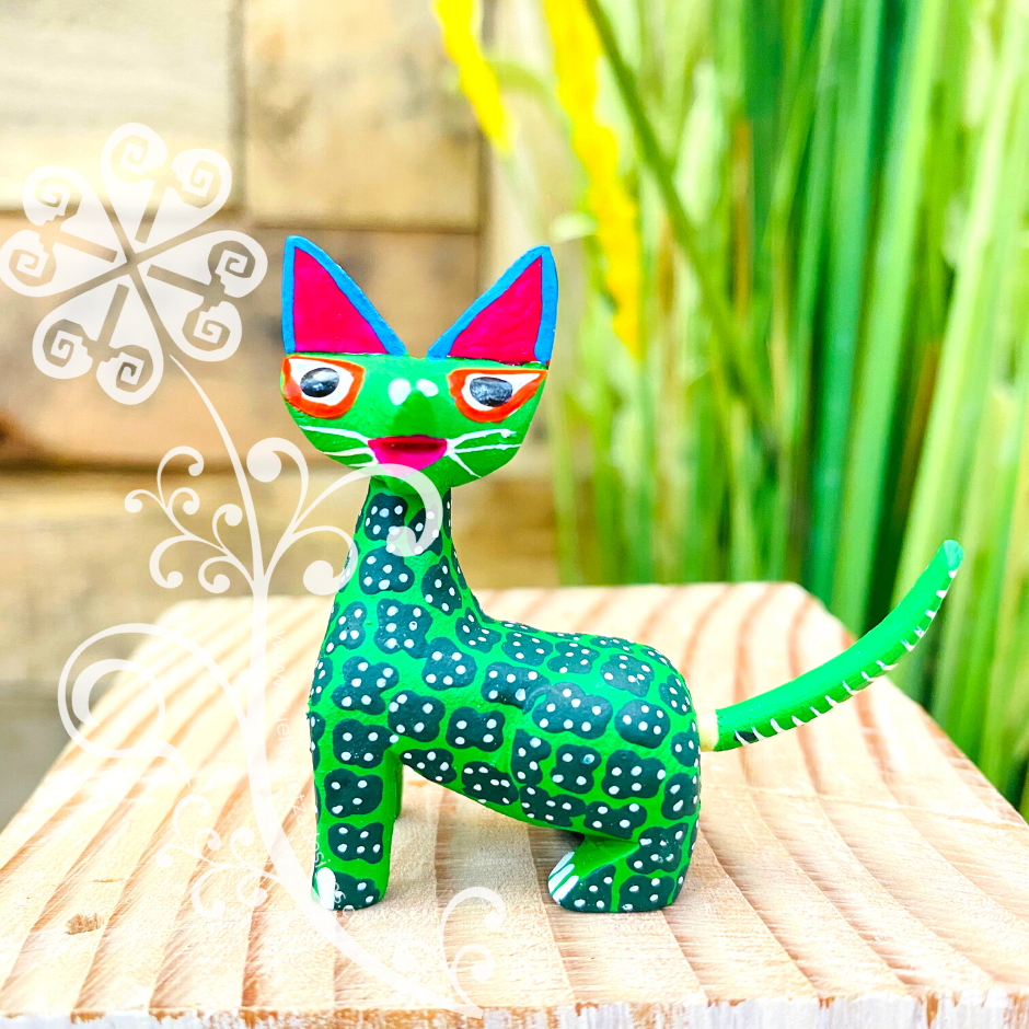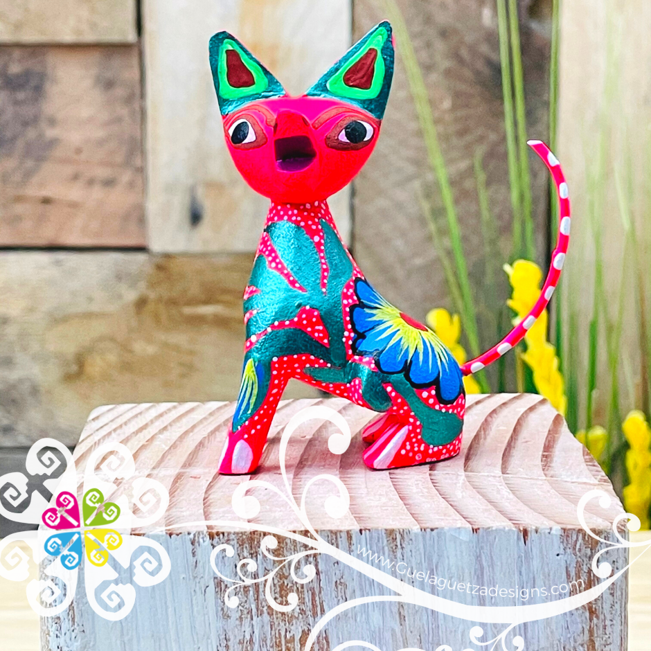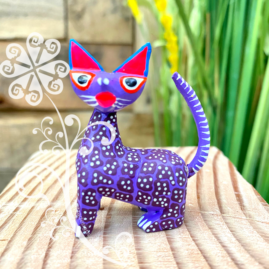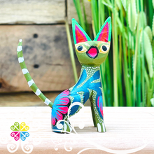 One of a kind hand carved wooden figures by Zeny and Reyna, from Tilcajete, Oaxaca. Each piece is inspired by the cultural mosaic from Oaxacan indigenous groups. Nature’s elements such as sun, earth, water, wind, and fire are represented on each colorful design.