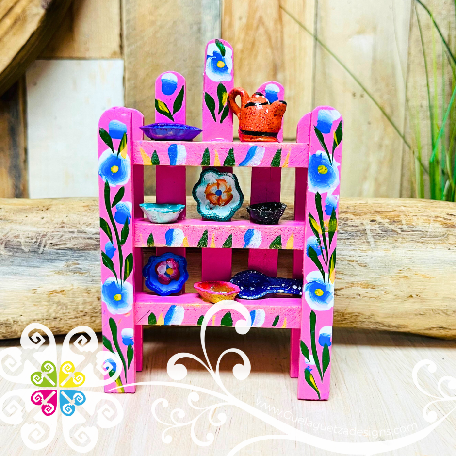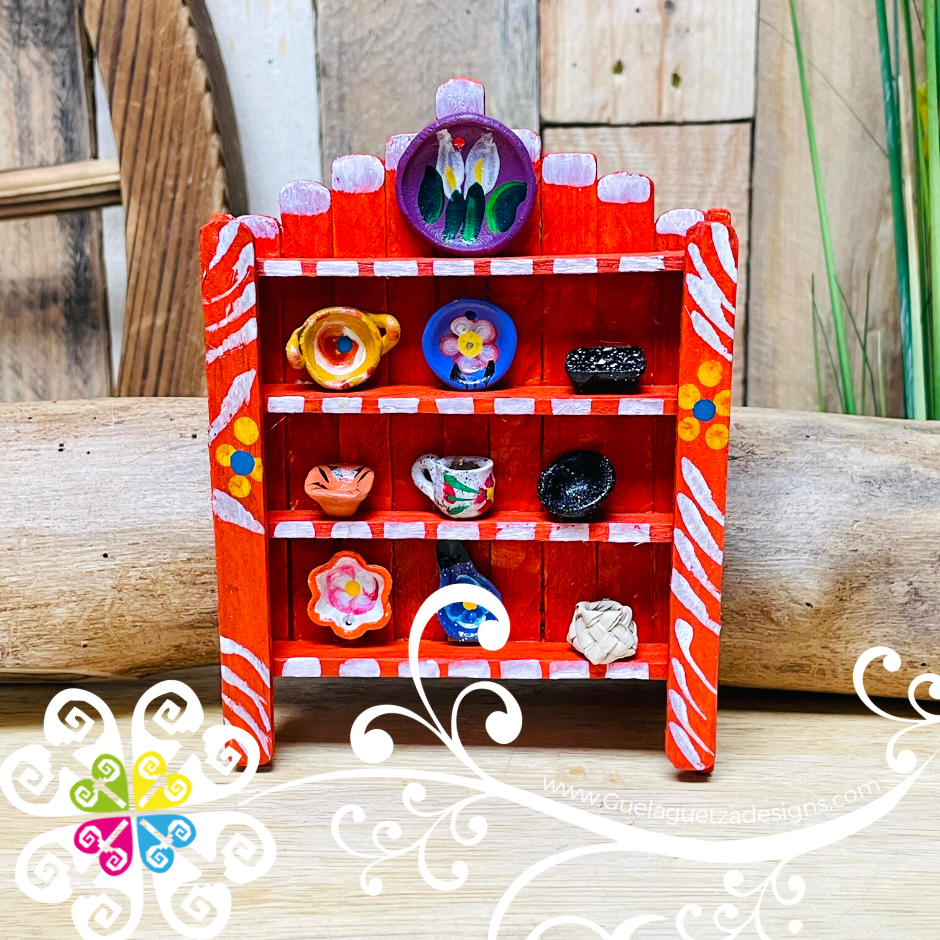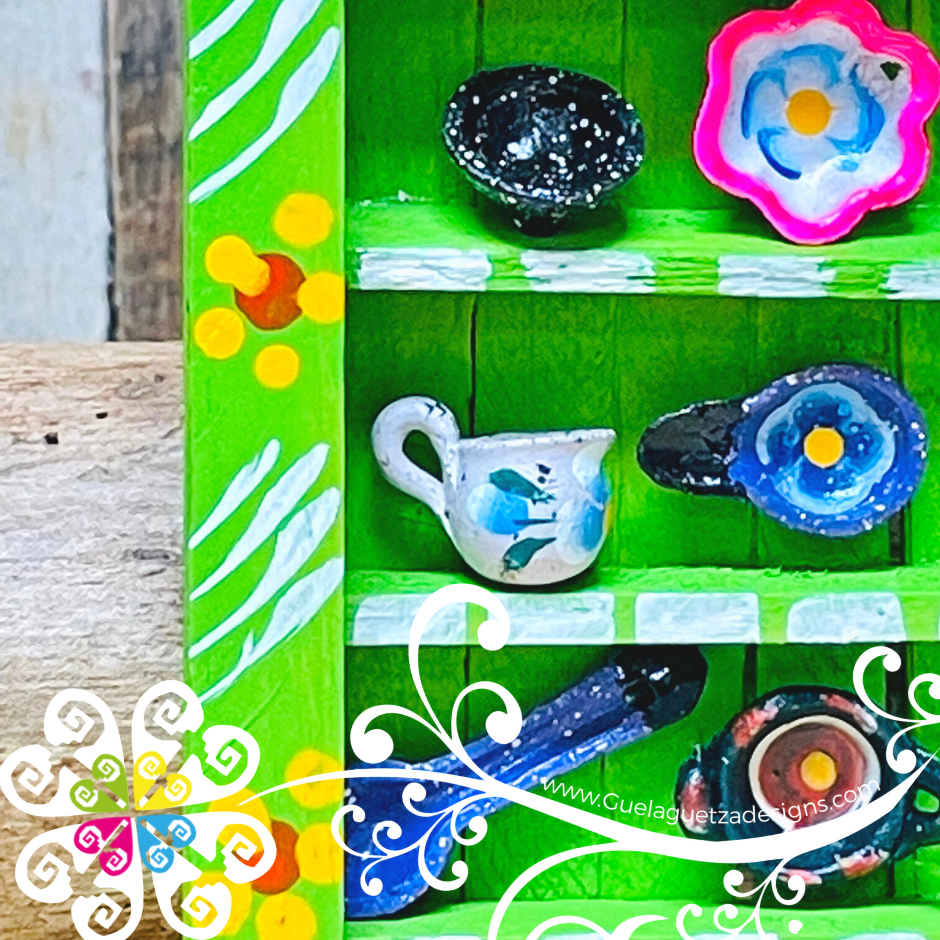 Super cute wall decor with mini Mexican accessories! Miniature mug, plate, molcajete, cazuela, olla and many more may be included in this mini trastero!