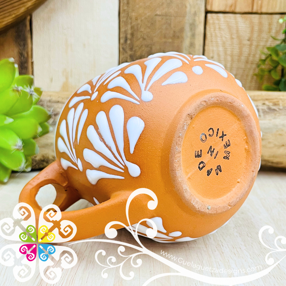 Beautiful clay mug and spoon created using an ancient process by workshop Ceramez from Dolores Hidalgo, Mexico. Each design is crafted by hand, with love and passion. Perfect for decoration or safe to drink any cold or hot liquids from it.