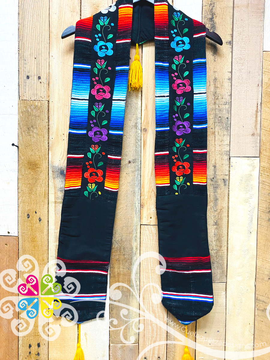 Front is made with sarape fabric from Tlaxcala and decorated with beautiful machine embroider done in Oaxaca. You will love the little tassels in the front and one in the back. Add two words to each side (or can be a logo or figure)